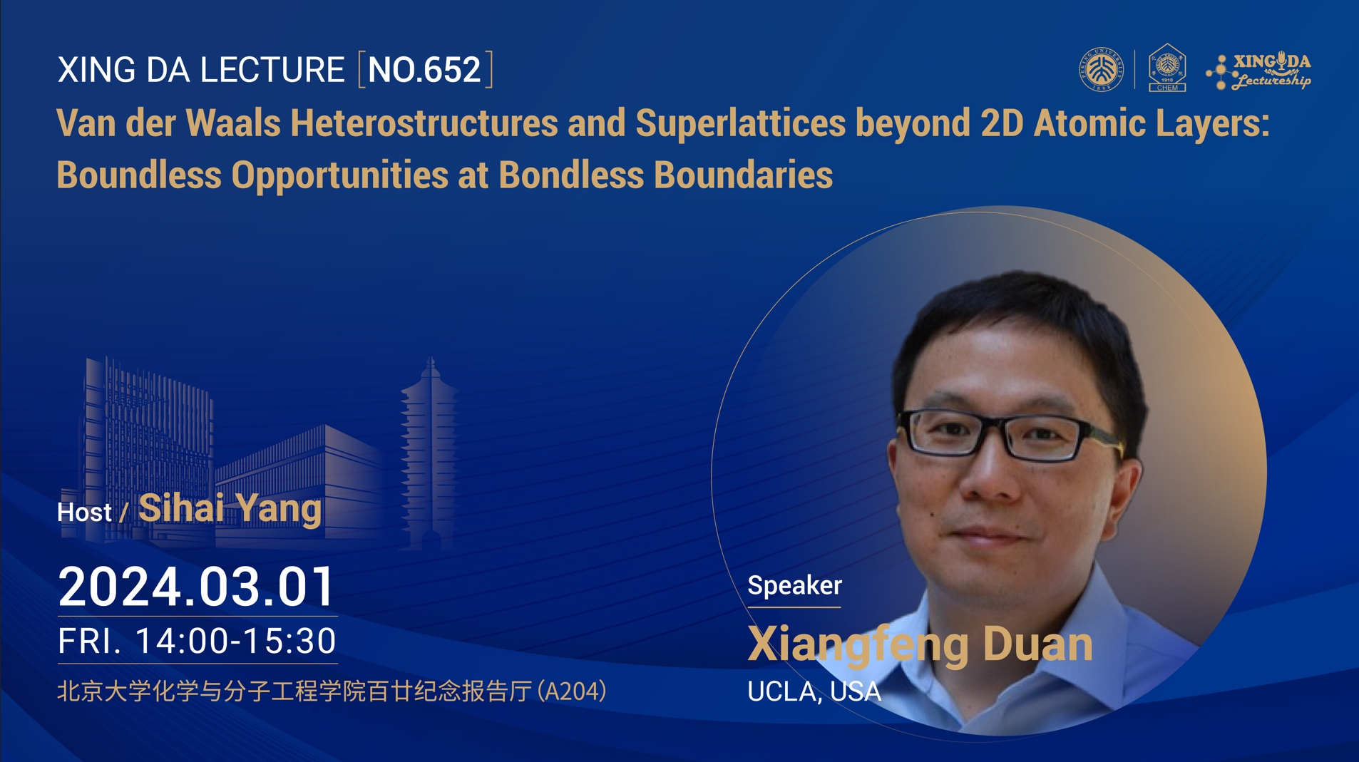 Dr. Xiangfeng Duan received his B.S. Degree from University of Science and Technology of China in 1997, and Ph.D. degree from Harvard University in 2002. From 2002-2008, he was a Founding Scientist responsible for advanced technology development at Nanosys Inc., a nanotechnology startup founded based partly on his doctoral research. Dr. Duan joined UCLA with a Howard Reiss Career Development Chair in 2008, and was promoted to Associate Professor in 2012 and Full Professor in 2013. His research interest includes nanoscale materials, devices and their applications in future electronic and energy technologies. Dr. Duan has received many awards for his pioneering research in nanoscale science and technology, including MIT Technology Review Top-100 Innovator Award, NIH Director’s New Innovator Award, NSF Career Award, Alpha Chi Sigma Glen T. Seaborg Award, US Presidential Early Career Award for Scientists and Engineers (PECASE), ONR Young Investigator Award, DOE Early Career Scientist Award, Human Frontier Science Program Young Investigator Award, Dupont Young Professor, the Beilby Medal and Prize, International Society of Electrochemistry Zhao-Wu Tian Prize for Energy Electrochemistry, Materials Research Society Middle Career Researcher Award, IEEE Nanotechnology Council Distinguished Lectureship, and most recently the IEEE Pioneer Award in Nanotechnology. He is currently a Fellow of Royal Society of Chemistry, American Association for the Advancement of Science and National Academy of Inventors.