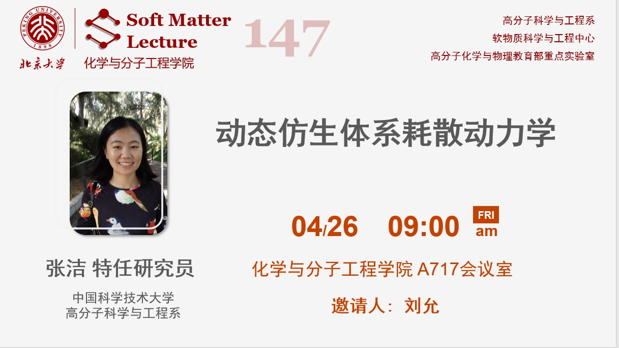 张洁,中国科学技术大学高分子科学与工程系特任研究员,2011年毕业于中国科学技术大学化学系,获化学学士学位。2017年博士毕业于伊利诺伊大学香槟分校材料科学与工程系,师从美国科学院院士Steve Granick。2017/10-2021/10在加州大学圣巴巴拉分校物理系从事博士后研究,合作导师为 Zvonimir Dogic. 2021年10月加入中国科学技术大学高分子科学与工程系至今。入选中国科学院率先行动“百人计划”项目B类、安徽省“百人计划”青年人才项目; 主持国家自然科学基金委青年项目和面上项目。近年来,以第一作者或通讯作者身份在Phys. Rev. Lett.、 Nature Physics、Angew. Chem.、Chem. Soc. Rev. 等杂志发表论文。
