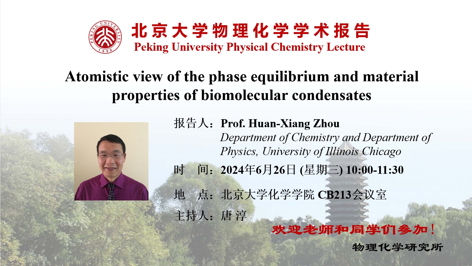 Huan-Xiang Zhou received his Ph.D. from Drexel University in 1988 and did postdoctoral work at the National Institutes of Health. After faculty appointments at Hong Kong University of Science and Technology, Drexel University, and Florida State University, he moved in 2017 to the University of Illinois Chicago, where he is Professor of Chemistry and Physics and holds an LAS Endowed Chair in the Natural Sciences. He was elected a fellow of the American Association for the Advancement of Science and a fellow of the American Physical Society. His group does theoretical, computational, and experimental research on molecular and cellular biophysics. Current interests include phase equilibrium and material properties of biomolecular condensates; membrane association and binding kinetics of intrinsically disordered proteins; functional mechanisms of glutamate-receptor ion channels; and structures and aggregation pathways of amyloid-beta and other amyloidogenic proteins.