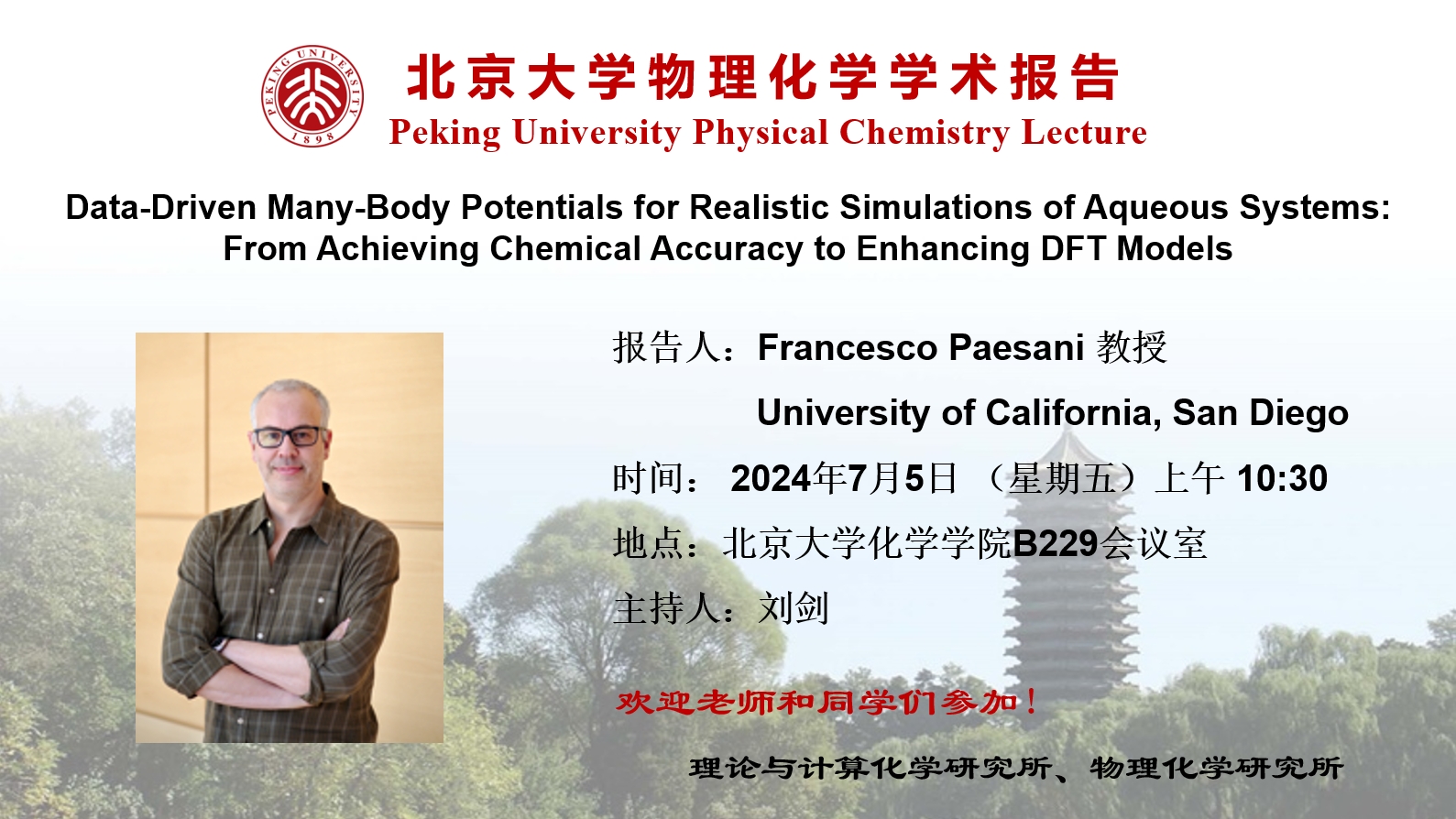Francesco Paesani received his Ph.D. in Theoretical Physical Chemistry from the University of Rome “La Sapienza” in 2000. He was a postdoctoral fellow at the University of California, Berkeley, working with Professor Birgitta Whaley, and at the University of Utah, working with Professor Gregory Voth. In 2009, he joined the faculty of the University of California, San Diego, where he was promoted to Associate Professor in 2015 and Professor in 2017. He is currently the Kurt Shuler Faculty Scholar in the Department of Chemistry and Biochemistry, and is affiliated with the Materials Science and Engineering graduate program and the San Diego Supercomputer Center. He is a founding member of the Halicioǧlu Data Science Institute. His research focuses on the development, implementation, and application of many-body theories at the intersection of chemistry, physics, and computer science for molecular simulations of complex systems from the gas to the condensed phase. He was awarded the ACS OpenEye Outstanding Junior Faculty Award in Computational Chemistry in 2014, the NSF CAREER Award in 2015, the ACS Early Career Award in Theoretical Chemistry in 2016, the Legacy Lecture Award from UC San Diego student body in 2017, and the Cozzarelli Prize from the National Academy of Sciences (2019). He served as the Chair of the ACS Theoretical Chemistry Subdivision (2019). He currently serves as the Vice Chair of the ACS Division of Physical Chemistry and an associate editor for Science Advances.