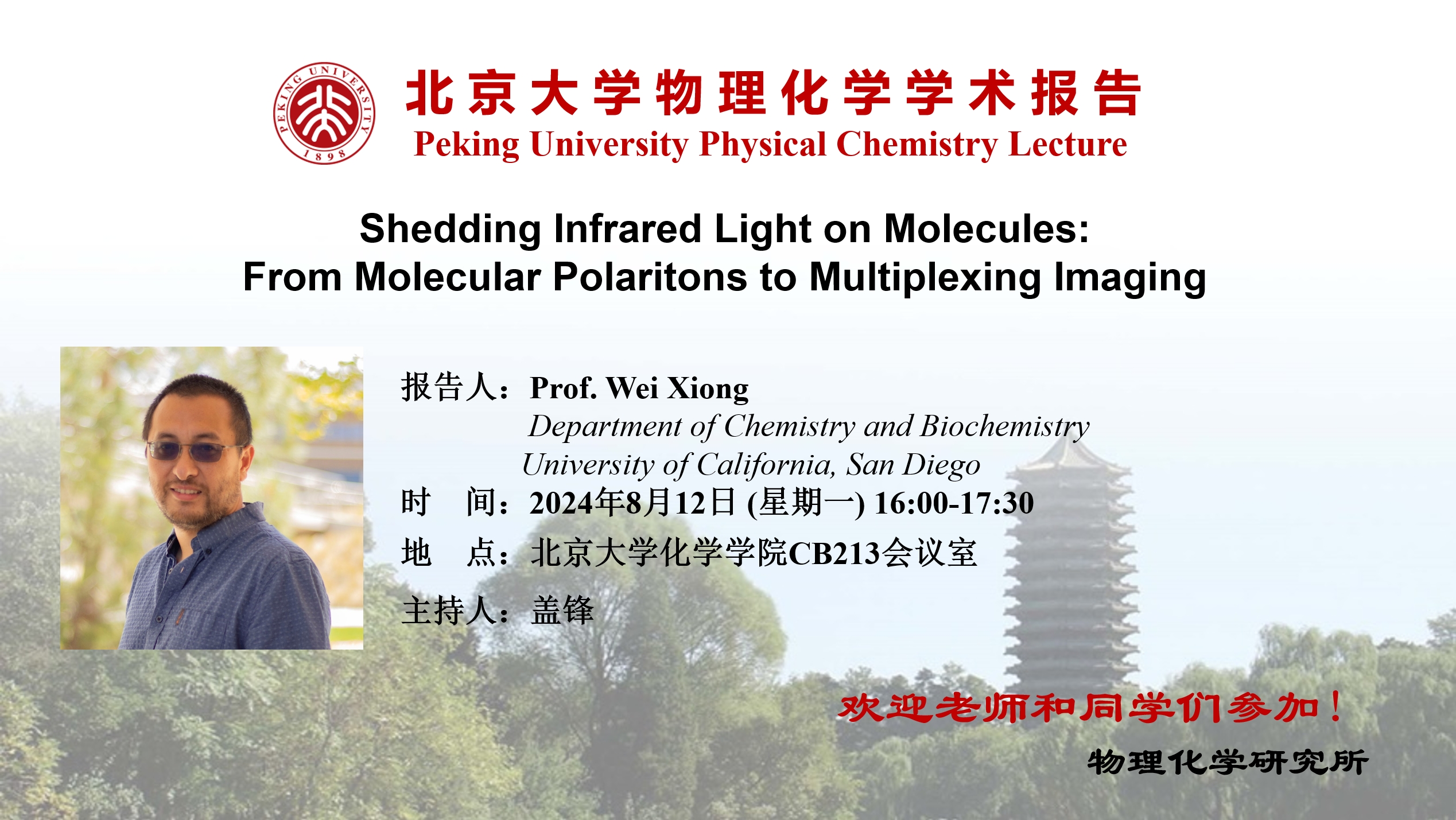 In the first half of this talk, Prof. Wei Xiong will delve into the dynamics of molecular vibrational polaritons – a hybrid quasiparticle between light and matter through strong coupling interactions.1-4 Using two-dimensional infrared (2D IR) spectroscopy, we have unambiguously demonstrated that polaritons can efficiently promote energy transfer within or between molecules, subsequently slowing down competing reaction pathways. This research sheds light on the potential roles of polaritons in modifying chemical landscapes and influencing reaction pathways. The second half of this talk will discuss the development of a new IR-based imaging technique - MultiDimensional Widefield Infrared-encoded Spontaneous Emission (MD-WISE) microscopy.5 This technique takes advantages of the IR-visible double resonance interactions, which enable using IR photon to modulate fluorescence imaging. As a result, it allows for the distinction of chromophores with overlapping emission spectra by leveraging mid-infrared pulses to encode spatial and temporal data into photoluminescence images. This method shows promises for multiplexing detection channels in biomedical imaging of complex biological entities. These research results highlight how mid-infrared light-matter interaction serves as a powerful mean for both manipulating molecular dynamics and enhancing imaging capabilities, thereby offering new insights into molecular behaviors and interactions at the nano-scale. The implications of these technologies extend across chemistry and biophysics, promising new avenues for research and application in fields ranging from chemical, materials science to biomedical imaging.