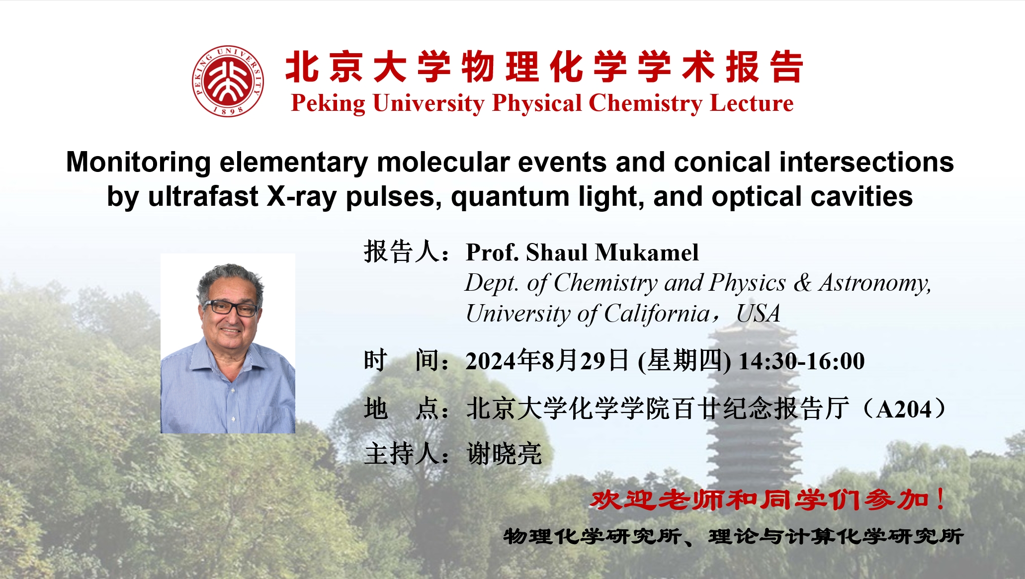Shaul Mukamel, a Distinguished Professor of Chemistry and Physics & Astronomy at the University of California, Irvine, had received his Ph.D. in 1976 from Tel Aviv University and held faculty positions at Rice University, the Weizmann Institute, and the University of Rochester. His research interests focus on the design of novel ultrafast multidimensional-coherent-optical spectroscopies for probing and controlling electronic and vibrational molecular dynamics in the condensed phase. His recent work involves investigating how to use novel X-ray pulses, quantum light, and entangled photons in spectroscopy. He is the author of over 1000 publications and the textbook "Principles of Nonlinear Optical Spectroscopy (1995). He is a Fellow of the American Physical Society , the Optical Society of America and an elected member of the American Academy of Arts & Sciences, the National Academy of Sciences, and the Indian National Science Academy . His recent awards include the Ahmed Zewail ACS Award in Ultrafast Science and Technology (2015), the Coblentz Society ABB Sponsored Bomem-Michelson Award (2016), the OSA William F. Meggers Award (2017), Honorary Ph.D., University of Chicago (2017), Joseph O. Hirschfelder Prize in Theoretical Chemistry, University of Wisconsin-Madison (2019), Arthur L. Schawlow Prize in Laser Science, (APS) (2020), and Elected Fellow of the Hagler Institute of Advanced Studies, Texas A&M University (2020).