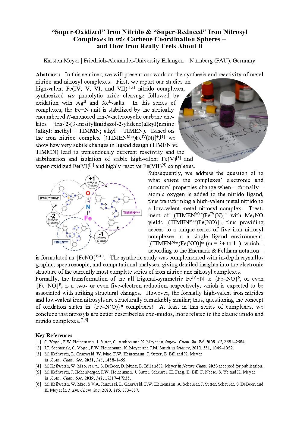 Prof. Dr. Karsten Meyer studied chemistry (October 1989 – 1994) at the Ruhr-University of Bochum (Germany) and received his Diploma in May 1995. Starting in the summer of 1995, he performed his Ph.D. thesis work under the direction of Professor Karl Wieghardt at the Max Planck Institute in Mülheim/Ruhr (Germany) and received his Ph.D. (Dr. rer. nat, summa cum laude) in January 1998. With a DFG post-doctoral fellowship, Karsten gained research experience in Professor Christopher Cummins’ laboratory at the Massachusetts Institute of Technology (1998 – 2000, MIT, Cambridge, MA, USA). In January 2001, he was appointed to the University of California, San Diego (UCSD) faculty as an Assistant Professor and was named an Alfred P. Sloan Fellow in 2004. In 2006, he accepted an offer (C4/W3) to be the Chair of the Institute of Inorganic & General Chemistry at the Friedrich-Alexander-University of Erlangen-Nürnberg (FAU), Germany. Karsten Meyer has published 300+ articles in peer-reviewed journals, leading to an h-index of 67 and 14,500+ citations (Scopus, 09/2024). The list of publications includes, among others, reports and articles in Science, Nature, Nature Chem., Chem, Journal of the American Chemical Society, Angewandte Chemie, and Chemical Science. He has given over 250 invited talks, including opening and plenary lectures, at conferences, research, and academic institutions worldwide.