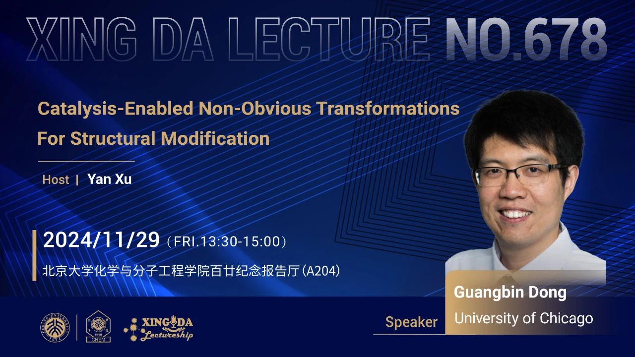 Professor Guangbin Dong received his B.S. degree from Peking University and completed his Ph.D. degree in chemistry from Stanford University with Professor Barry M. Trost, where he was a Larry Yung Stanford Graduate fellow. In 2009, he began to research with Professor Robert H. Grubbs at California Institute of Technology, as a Camille and Henry Dreyfus Environmental Chemistry Fellow. In 2011, he joined the department of chemistry and biochemistry at the University of Texas at Austin as an assistant professor and a CPRIT Scholar. Since 2016, he has been a Professor of Chemistry at the University of Chicago. Now, he is the first chair of the Weldon G. Brown Professorship.