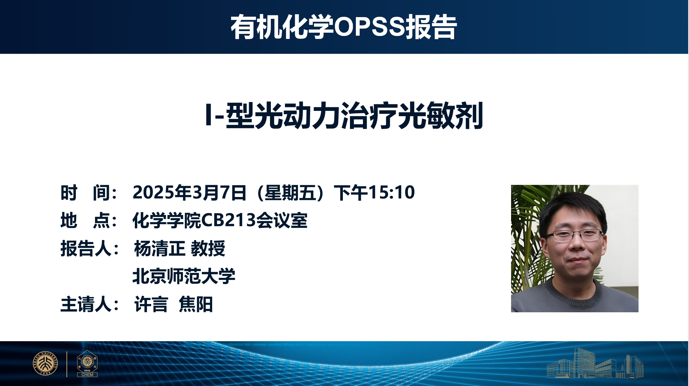 杨清正教授,北京师范大学化学学院教授、博士生导师。1998年在郑州大学化学系获得理学学士学位,2003年在中国科学院理化技术研究所获得理学博士学位,2003–2009年期间先后在法国路易斯巴斯德大学(斯特拉斯堡大学)和美国伊利诺伊大学香槟分校从事博士后研究工作。2009年回到中国科学院理化技术研究所工作,2014年调动到北京师范大学化学学院任教。主要研究方向为超分子光化学,设计合成新型小分子染料或构建光响应组装体系,深入研究体系的光物理与光化学性质,探索其在发光材料、生物探针、光动力治疗等诸多领域的应用。迄今为止在 J. Am. Chem. Soc. 、 Angew. Chem. Int. Ed. 、 Nat. Commun. 、 Adv. Mater. 等国际一流期刊上发表论文100余篇。杨清正教授曾获得获中科院“百人计划”(2010)、基金委优秀青年科学基金(2012)、国家杰出青年科学基金(2015)、中国化学会物理有机化学青年奖(2021)、亚洲及大洋洲光化学会青年科学家奖(2014)、牛顿高级学者基金(2015)等多项学术奖励。
