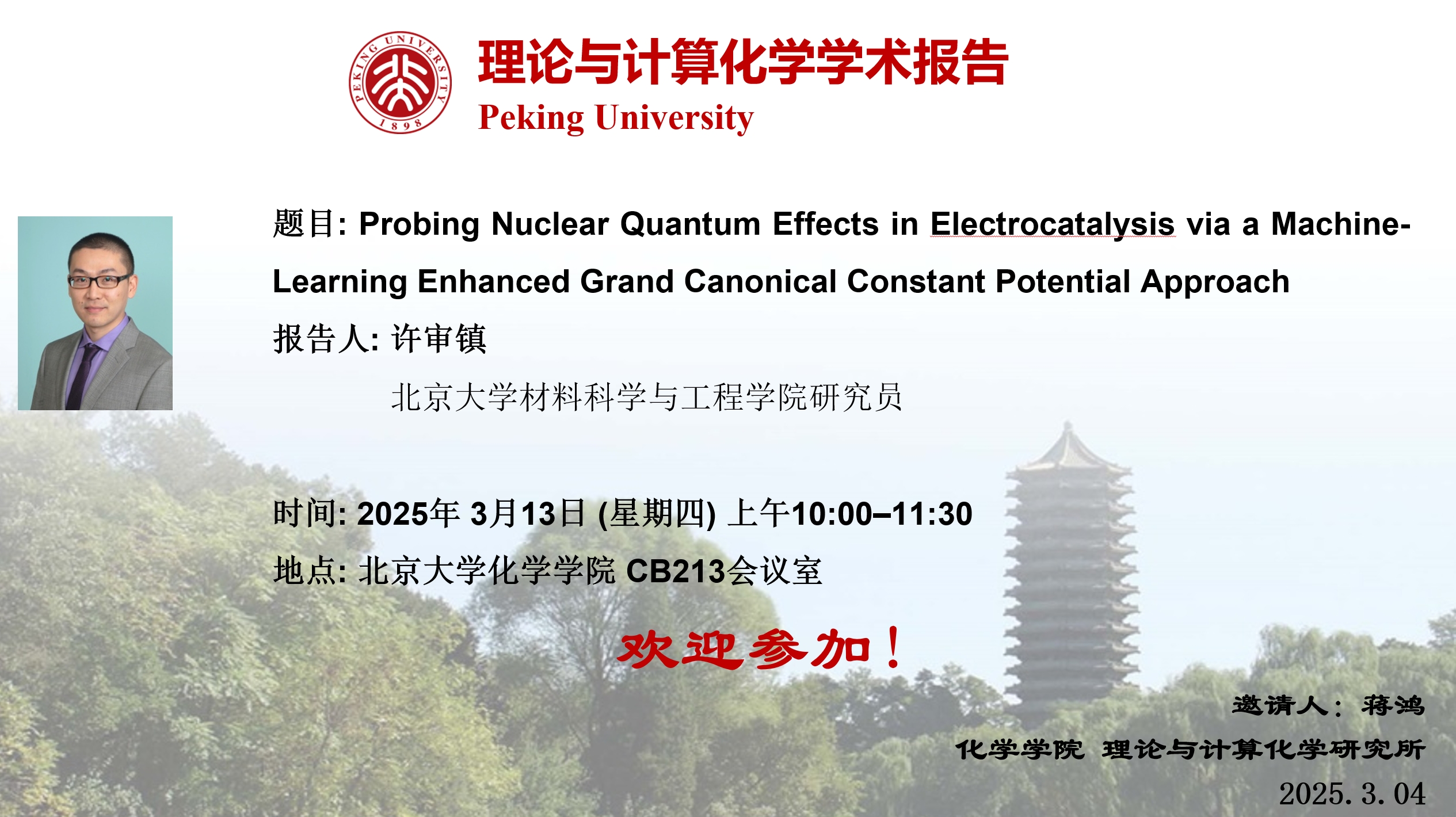 许审镇,北京大学材料科学与工程学院研究员(2020年9月至今),2011年本科毕业于清华大学物理系,2017年博士毕业于美国威斯康星大学麦迪逊分校(导师:Prof. Dane Morgan),2017-2020在美国普林斯顿大学开展博士后研究(导师:Prof. Emily Carter)。主要从事电化学体系表界面过程的计算模拟及方法开发工作。2022年2月至今在北京科学智能研究院(AISI)兼职负责电池材料理论计算团队。回国后以通讯作者身份在J. Am. Chem. Soc./ J. Phys. Chem. Lett./ J. Chem. Theory Comput./Adv. Funct. Mater./ACS Catal./npj Comput. Mater.等期刊发表论文十余篇,承担或参与多项国家、企业科研项目,并于2022年入选国家海外高层次人才引进计划青年项目。