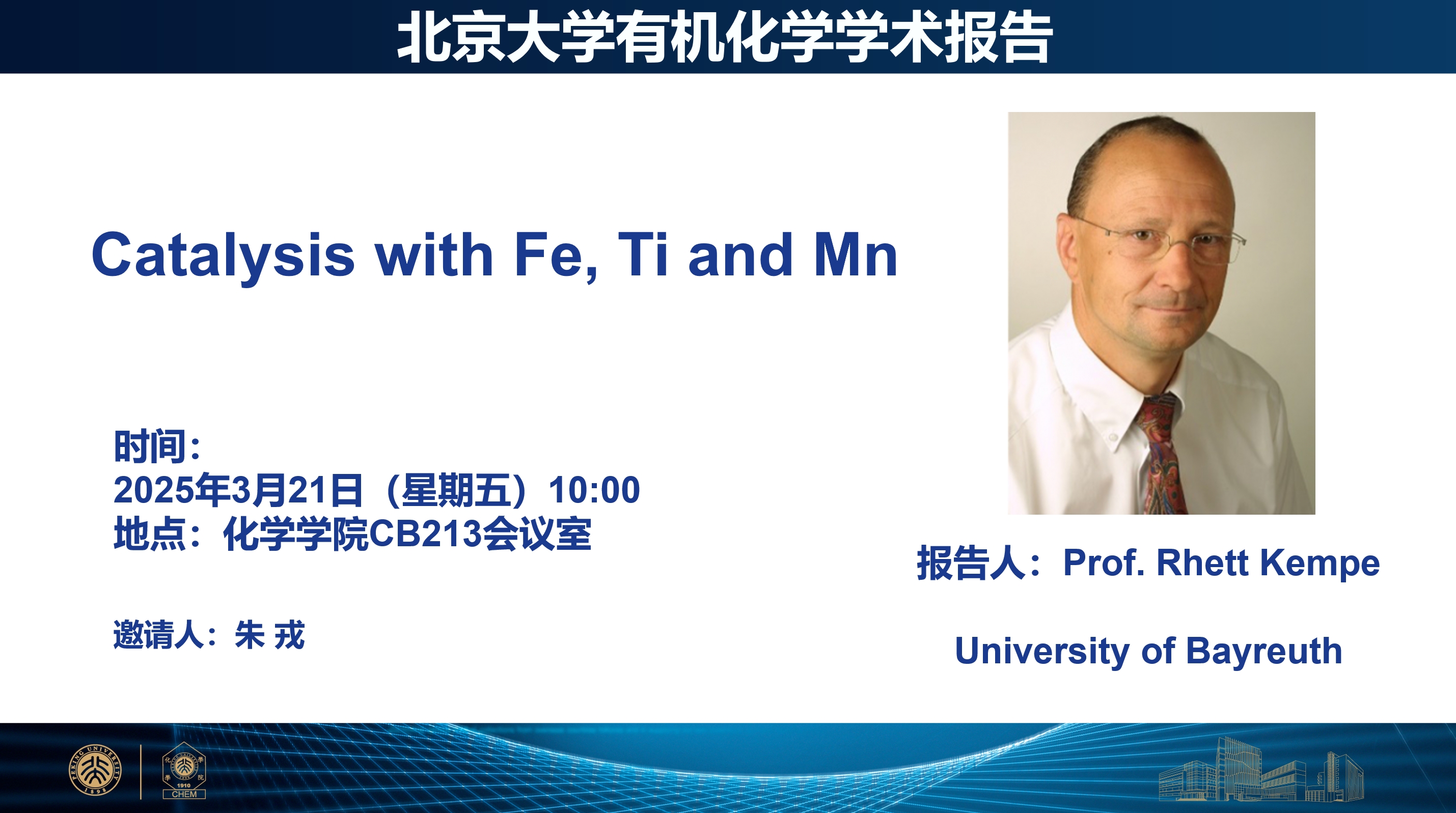 Rhett Kempe was born in Dresden in 1964 and spent his childhood in the beautiful landscapes of Dresden-Pillnitz. He studied chemistry at the University of Leipzig and received his PhD degree in organonickel chemistry under the supervision of J. Sieler in1992 including research stays in Jena (D. Walther) and Stuttgart (H.-G. von Schnering). Rhett Kempe worked as a postdoc with R. R. Schrock at MIT (1992/1993) and with C. Krüger at the “Max-Planck-Institut für Kohlenforschung” in Mülheim (1993/1994). After these postdoctoral stays, he started his independent carrier in the Max-Planck Group “Complex Catalysis” led by U. Rosenthal at the “Institut für Organische Katalyseforschung” (IfOK, now Leibniz Institute of Catalysis, LIKAT Rostock). The habilitation thesis (amido metal chemistry) was defended in 1998. He worked as a group leader and lecturer at the IfOK in Rostock and moved as a visiting lecturer to the University of Melbourne in 2000. He became a Professor of Inorganic Chemistry at the University of Oldenburg in 2001 and was appointed to a Chair of Inorganic Chemistry at the University of Bayreuth in 2002. Rhett Kempe received several offers from other Universities (2006: University of Rostock and the LIKAT and 2010: Humboldt University of Berlin), which were declined. His research interests are catalysis, especially reaction discovery, and homogeneous and heterogeneous catalysts. He is an author of more than 450 publications, has a h-index of 76, and has received numerous awards. Rhett Kempe was the Head of the Department of Chemistry of the University of Bayreuth from 2004 to 2007, the Dean and Vicedean of the Faculty of Biology, Chemistry and Geosciences of this University from 2009 to 2015, and a member of the University Council of the University of Bayreuth from 2015 till 2019.