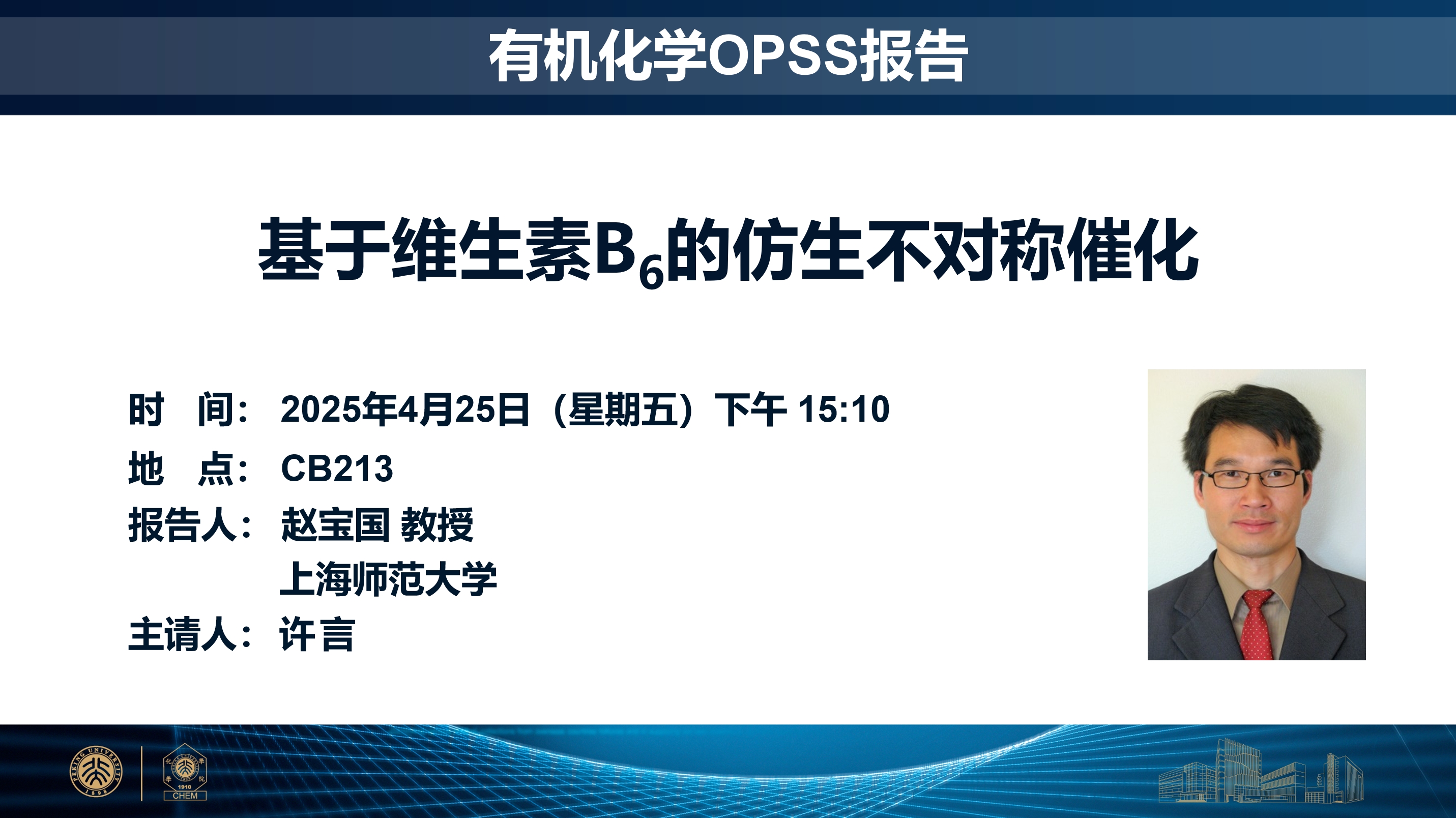 赵宝国, 上海师范大学化学系教授。1992-1996年于武汉大学化学系获理学学士学位;1999-2002年于南京大学化学系获理学硕士学位;2003-2006于中国科学院上海有机化学研究所获理学博士学位;2006-2011年于美国科罗拉多州立大学组从事博士后研究。2011年加入上海师范大学。致力于仿生催化与合成的研究,发展辅酶维生素B6的仿生不对称催化化学,包括手性吡哆醛/吡哆胺仿生催化体系、转氨化和 α-C-H 不对称官能化等仿生反应以及羰基催化的仿生催化策略等,研究成果在Science、Nat. Catal.、J. Am. Chem. Soc.、Angew. Chem. Int. Ed. 等期刊上发表。入选教育部长江学者、上海市东方学者特聘教授和上海市优秀学术带头人。