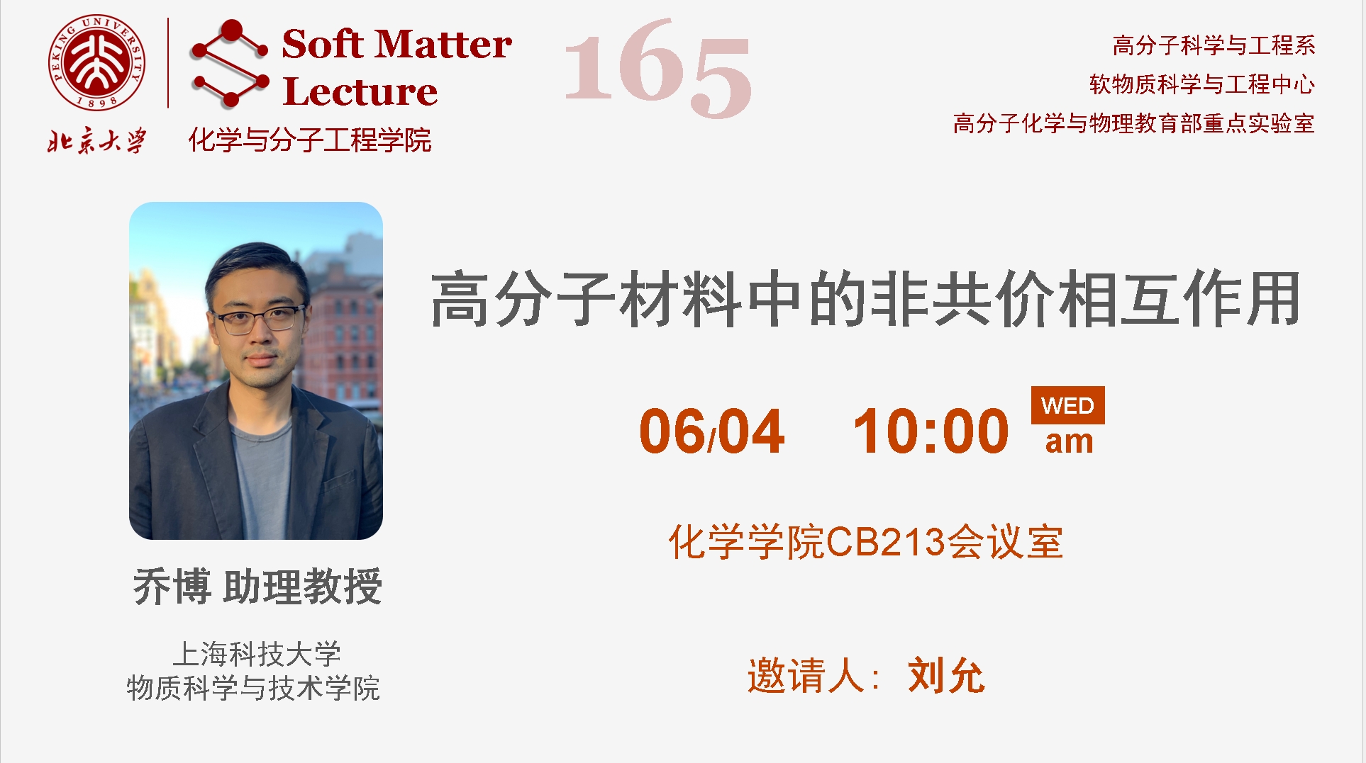 乔博,上海科技大学物质科学与技术学院助理教授,研究员。本科毕业于北京大学化学与分子工程学院。2017年在美国印第安纳大学取得化学博士学位,导师 Amar Flood。2017-2020 年在美国麻省理工学院从事博士后研究,合作导师为 Yang Shao-Horn(邵阳)和 Jeremiah Johnson。自2020年起任职上海科技大学,从事独立研究。主要的研究方向为超分子材料化学,涉及高分子电解质、药物递送高分子、光响应高分子等。