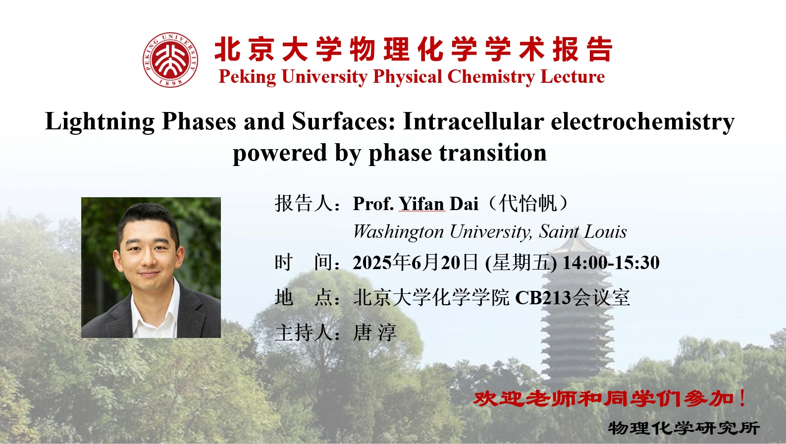 Professor Yifan Dai received his B.S. (2017) and Ph.D. (2020) in Chemical and Biomolecular Engineering from Case Western Reserve University, working with Prof. Chung Chiun Liu and Prof. Arnold Caplan on interfacing electrochemistry with synthetic biology. During his undergraduate and doctoral research, he focused on developing sensors and biosensors that have been applied in industrial and medical settings. In 2020, he joined Duke University as a postdoctoral scholar, jointly advised by Prof. Tosh Chilkoti and Prof. Lingchong You, where he worked on designing synthetic protein materials for cellular controls. In 2023, he joined Washington University in St. Louis as an Assistant Professor. His research group works at the interface of physical chemistry and biology, focusing on establishing the mechanisms of intracellular electrochemistry and developing synthetic biomolecules for manipulating cellular organizations. His works have been published in Cell, Chem, Nature Chemical Biology, Nature Microbiology, Nature Chemistry, Nature Chemical Engineering, Angewandte Chemie, Journal of the American Chemical Society. He was recently recognized by the Forbes 30 under 30 2025.