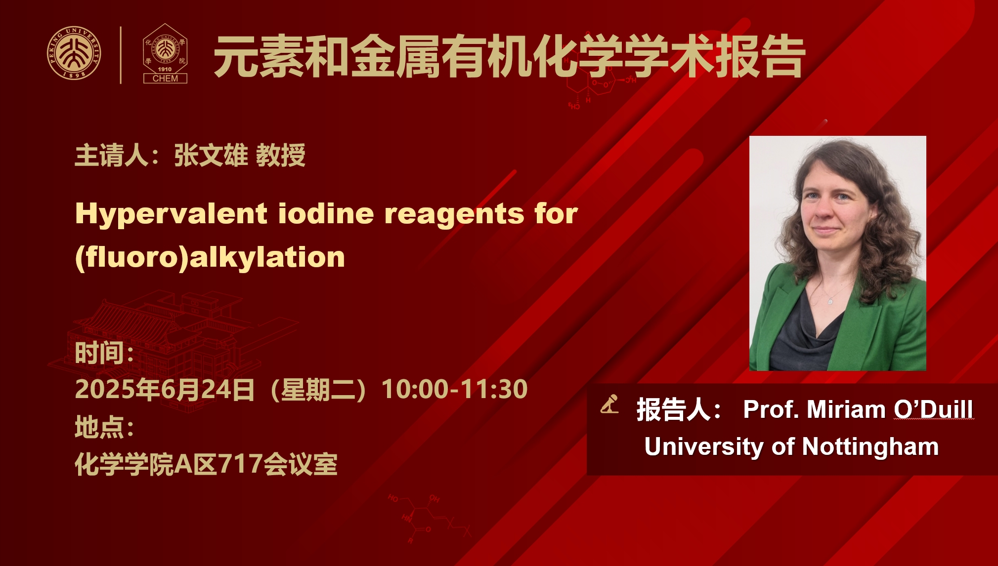 Miriam O’Duill received her D.Phil. in Organic Chemistry from the University of Oxford in 2016, where she carried out research on late-stage fluorination with Prof. Véronique Gouverneur. She spent two years as a DAAD postdoctoral fellow at the Scripps Research Institute, La Jolla, investigating selective catalytic functionalization of alkenes and alkynes with Prof. Keary M. Engle. In 2018, Miriam began her independent career at the University of Galway in Ireland, before accepting a position as Assistant Professor at the University of Nottingham in 2020. Her research interests span transition metal catalysis, isotopic labelling for medical imaging, and the development of sustainable, metal-free reaction methodology using hypervalent iodine reagents.