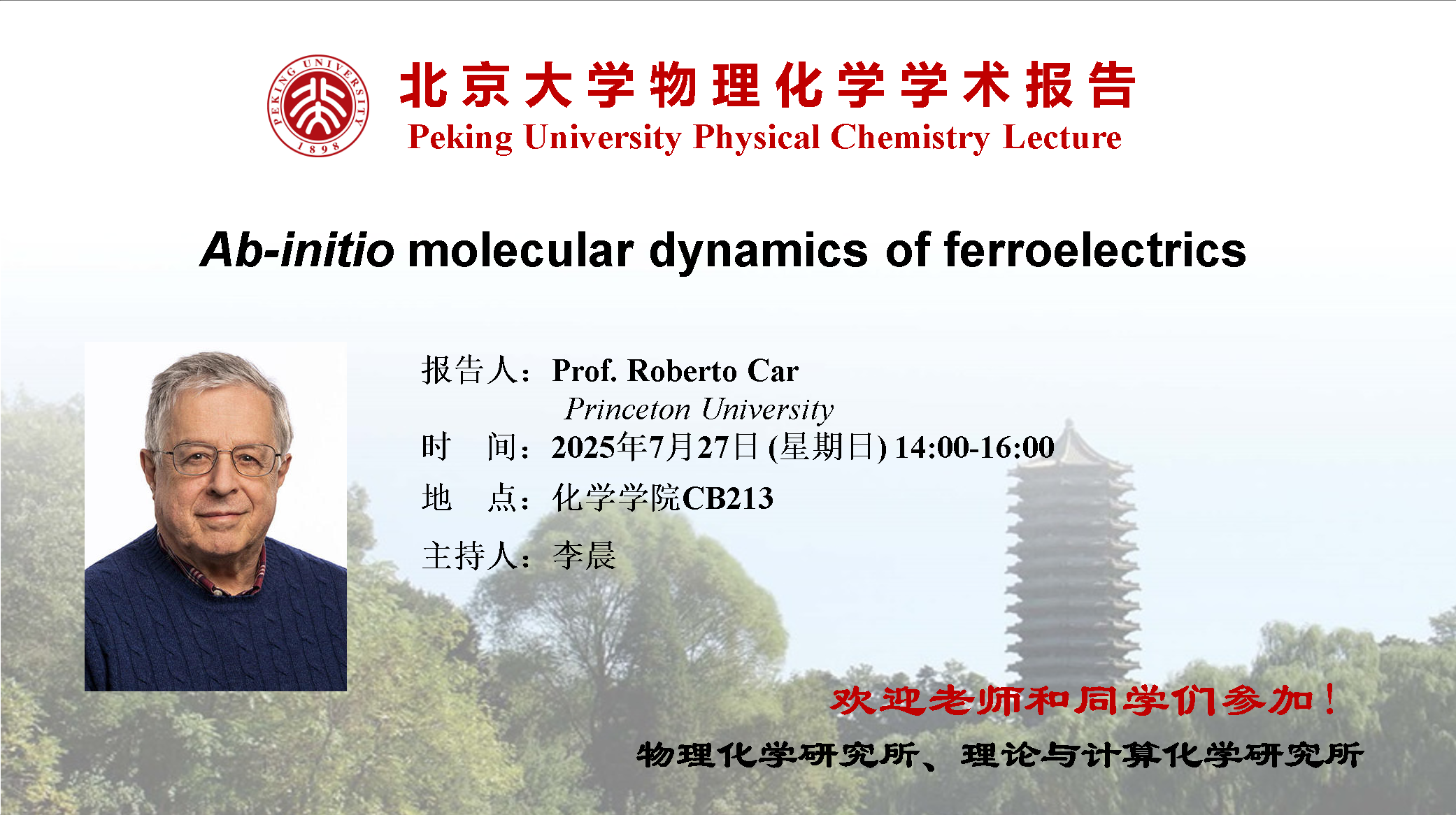 Professor Roberto Car is a world-renowned theoretical physicist acclaimed for foundational contributions to condensed matter physics and physical chemistry. He received his degree from Milan Technical University in 1971, followed by postdoctoral research at the University of Milan, École Polytechnique Fédérale de Lausanne (EPFL), and IBM’s Thomas J. Watson Research Center. He became Professor of Condensed Matter Physics at the University of Geneva in 1991, concurrently directing its Institute for Computational Materials Physics (IRRMA). Since 1999, he has served as Professor of Chemistry and Physics at Princeton University.