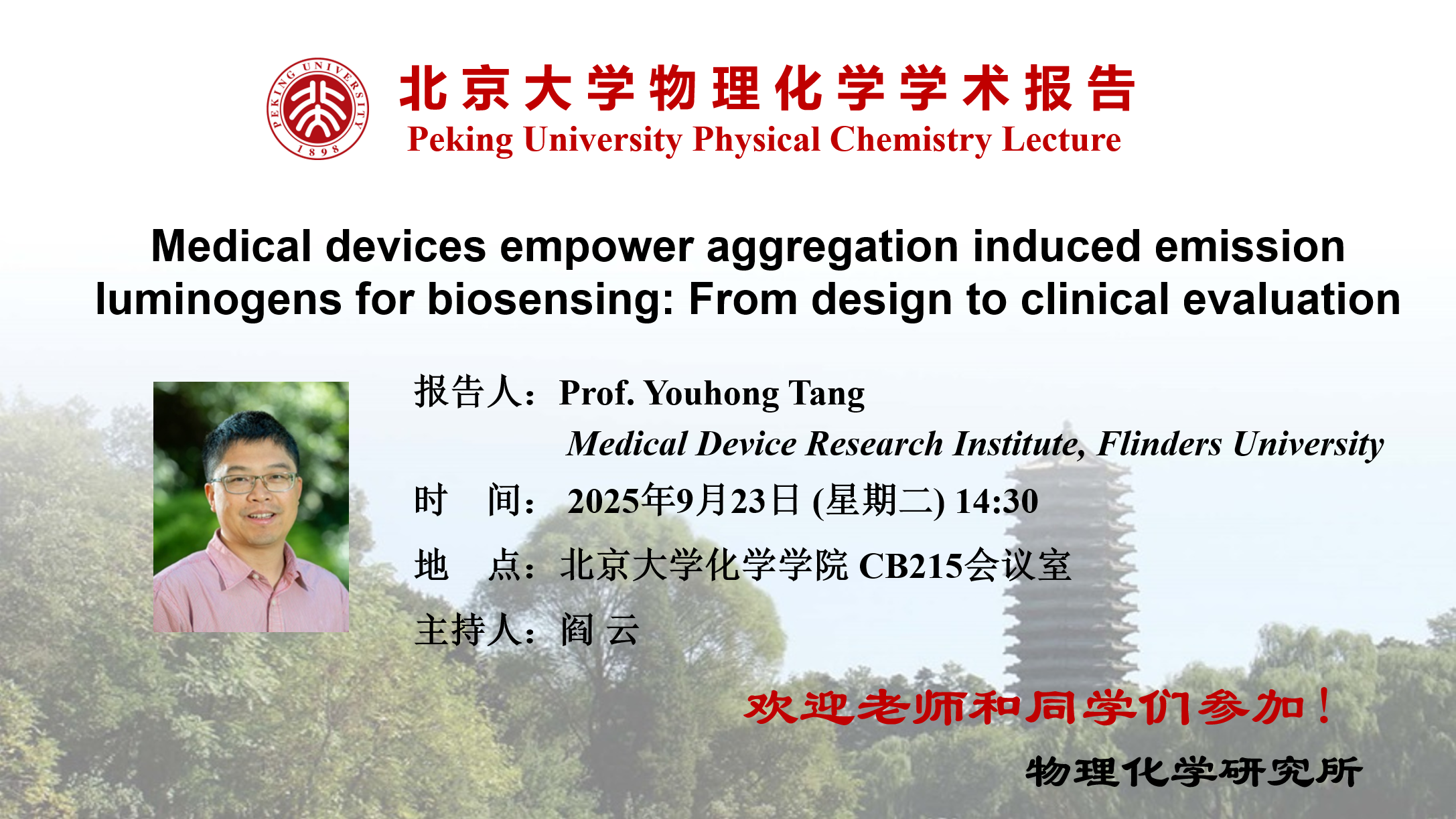 Youhong Tang is a Matthew Flinders Professor and was an Australian Research Council-Discovery Early Career Researcher at Flinders University. Currently, he is a Research Leader in Institute for NanoScale Science and Technology and Medical Device Research Institute at Flinders University. He is a Project Management Professional of Project Management Institute, US since 2008 and was elected as a Fellow of Royal Society of Chemistry, UK in 2018, a Fellow of Royal Australia Chemical Institute, Australia in 2021, a Certificated Materials Professional, Australia in 2021 and a Fellow of International Association of Advanced Materials, Sweden in 2024.