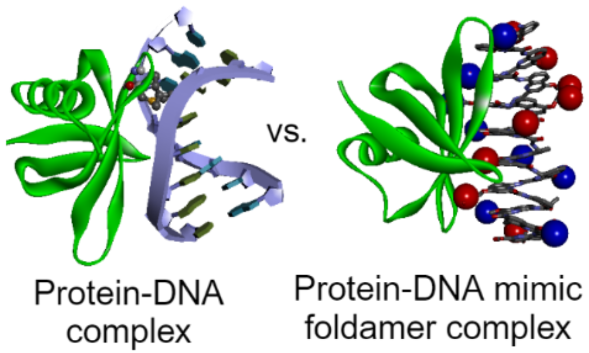Figure 1. Comparison of the crystal structures of a small chromosomal protein in complex with DNA (left) or with a foldamer that mimics DNA (right).[4a]