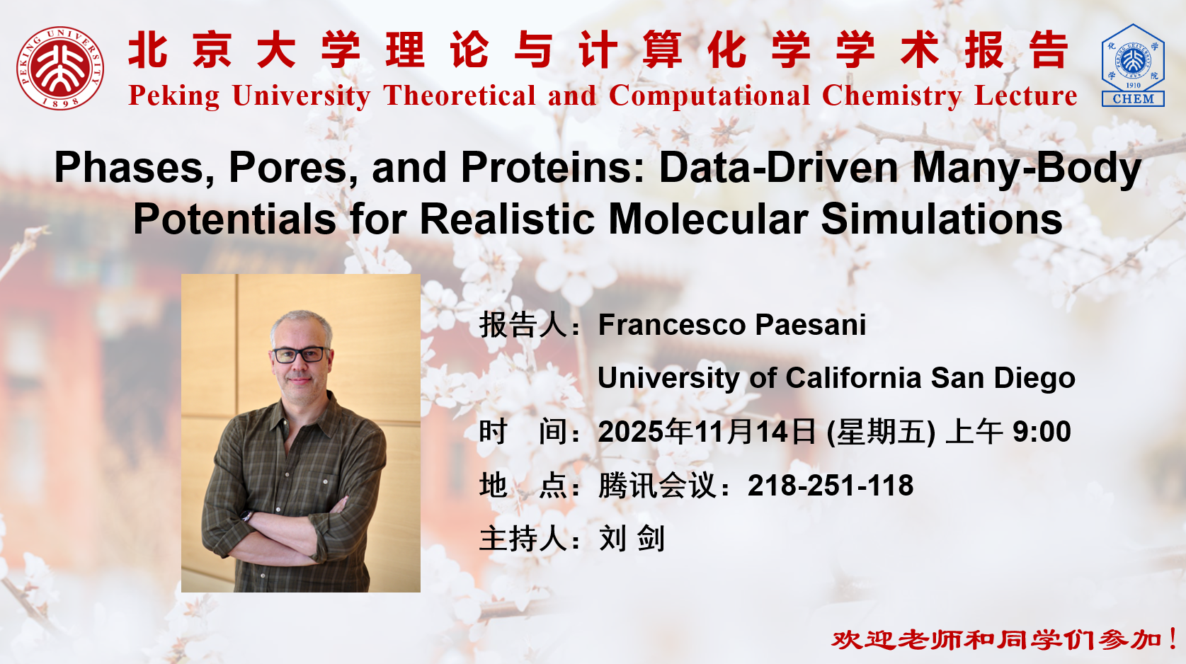 【北京大学理论与计算化学学术报告】Phases, Pores, and Proteins: Data‑Driven Many‑Body Potentials for Realistic Molecular Simulations