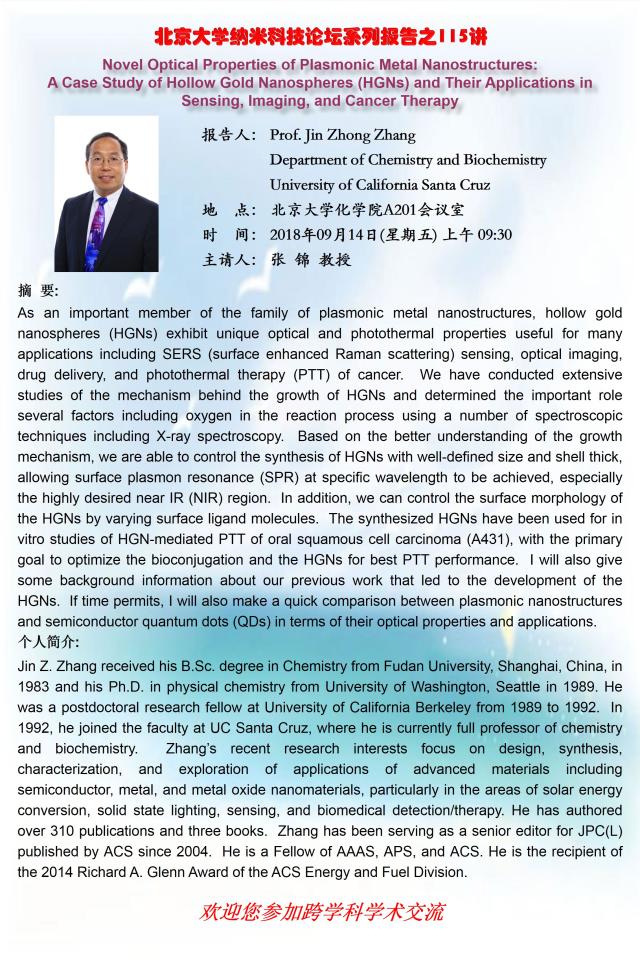 【北京大学纳米科技论坛系列报告之115讲】Novel Optical Properties of Plasmonic Metal Nanostructures: A Case Study of Hollow Gold Nanospheres (HGNs) and Their Applications in Sensing, Imaging, and Cancer Therapy