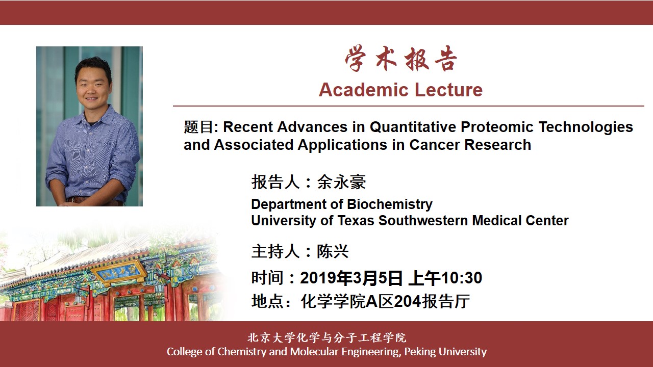 余永豪教授是德州大学西南医学中心生物化学系终身副教授,Simmons癌症中心成员, 同时是CPRIT Scholar in Cancer Reearch, Virginia Murchison Linthicum Scholar in Medical Research以及American Cancer Society Research Scholar. 余永豪课题组的主要研究方向是(1)开发超大规模定量蛋白质组的分析化学方法学,(2)运用这些大规模定量质谱新技术研究蛋白质翻译后修饰(包括磷酸化,泛素化,甲基化以及ADP-ribosylation)在细胞代谢,生长以及应激情况中的调控, (3)进而利用这些新的靶点信息,运用分子生物学以及动物模型来研究其在癌症以及代谢疾病中的功能。余永豪实验室已经利用这些机理信息转化而开发了一系列相关疾病的基于机制的靶点,生物标记物和药物新策略(组合用药,抗药性研究以及全新的靶向药物)。