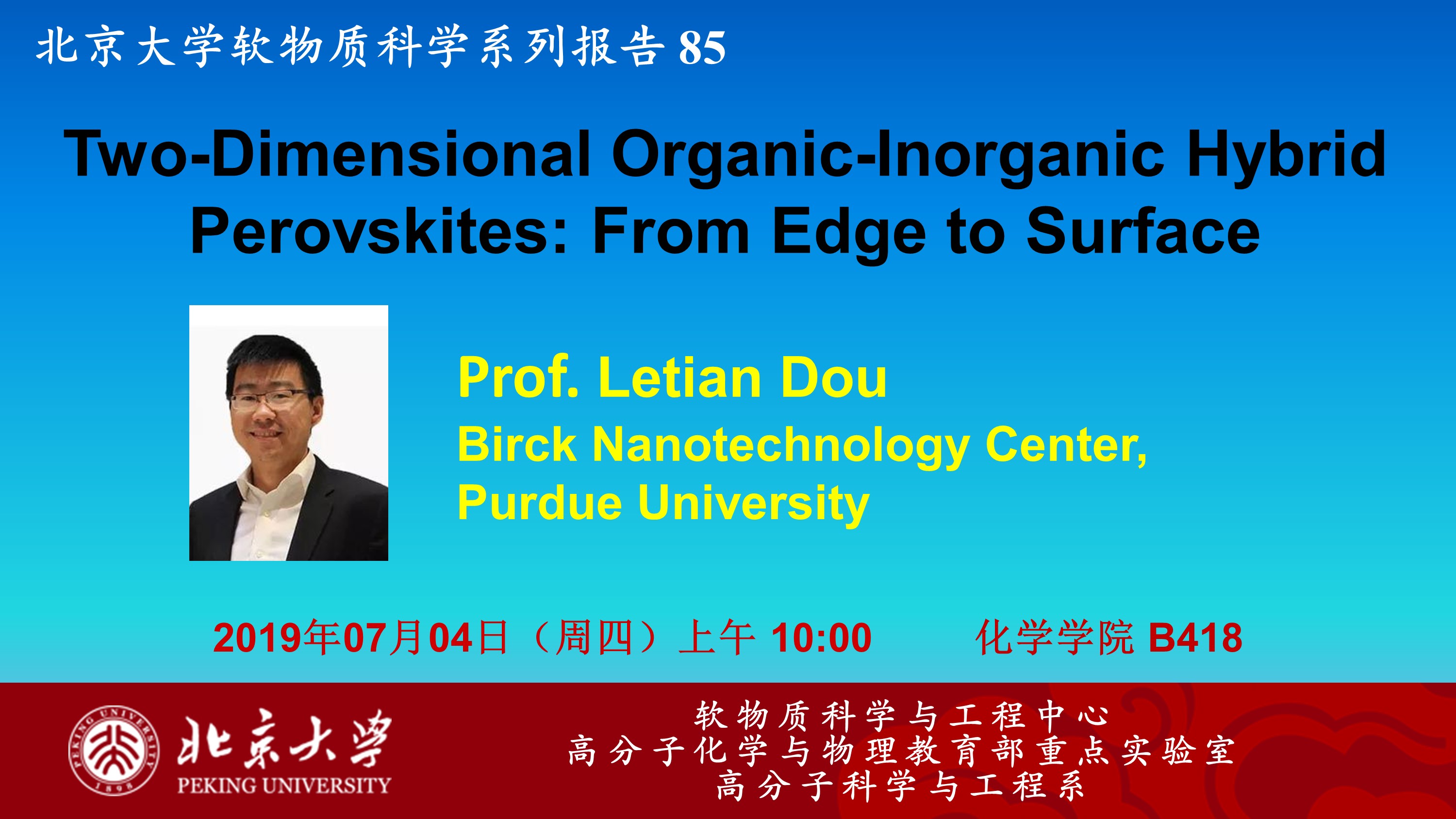 【北京大学软物质科学系列报告 85】Two-Dimensional Organic-Inorganic Hybrid Perovskites: From Edge to Surface