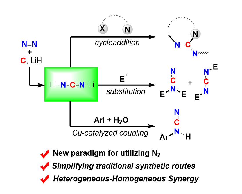 By synergizing the heterogeneous synthetic approach with the homogeneous synthetic methodology, N-containing organic compounds can be synthesized via activated N-containing species prepared from N2 gas and suitable carbon sources. From N2, carbon, and LiH, we have previously succeeded in the high-yield preparation of Li2CN2 as the activated N-containing species. In this work, we applied Li2CN2 as a novel synthetic synthon for constructing N-containing organic compounds. A series of reaction models, including substitution reaction, cycloaddition reaction, and transition metal-catalyzed coupling reaction, were successfully performed using Li2CN2 under mild conditions. Various valuable cyanamides, carbodiimides, N-aryl cyanamides and 1,2,4-triazole derivatives were readily synthesized in moderate to excellent yields. With this method, the 15N-labeled products, including oxazolidine derivatives with anti-cancer activity, could also be facilely prepared from 15N2 gas.