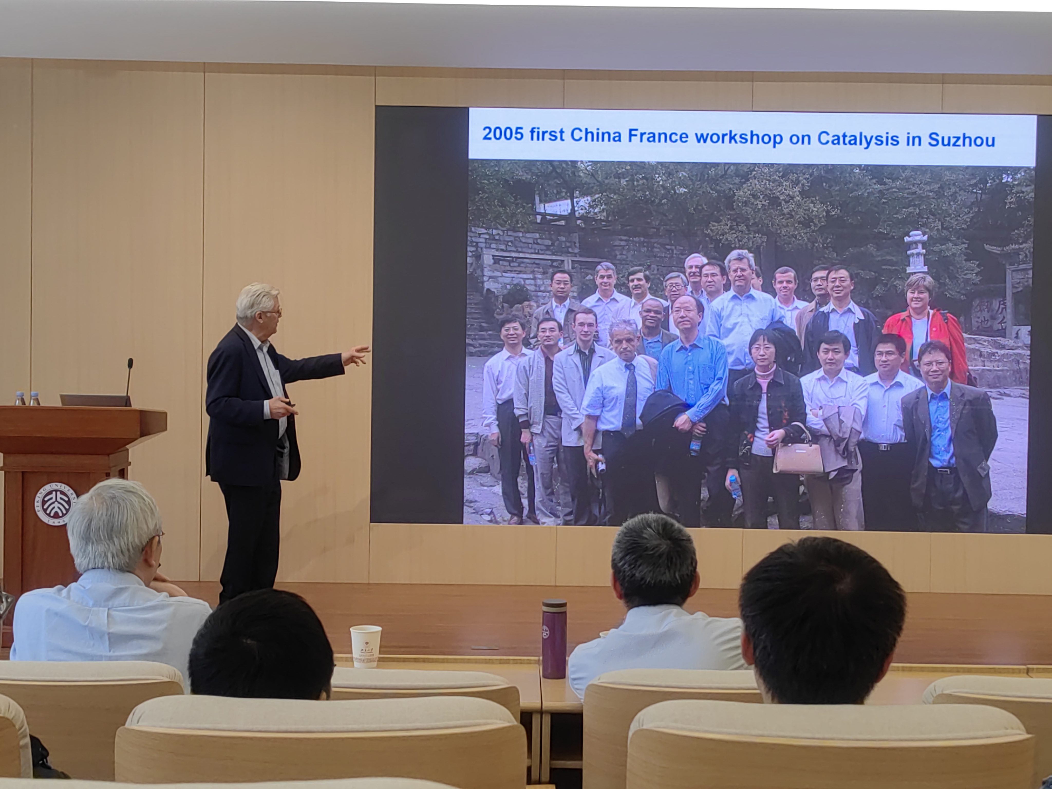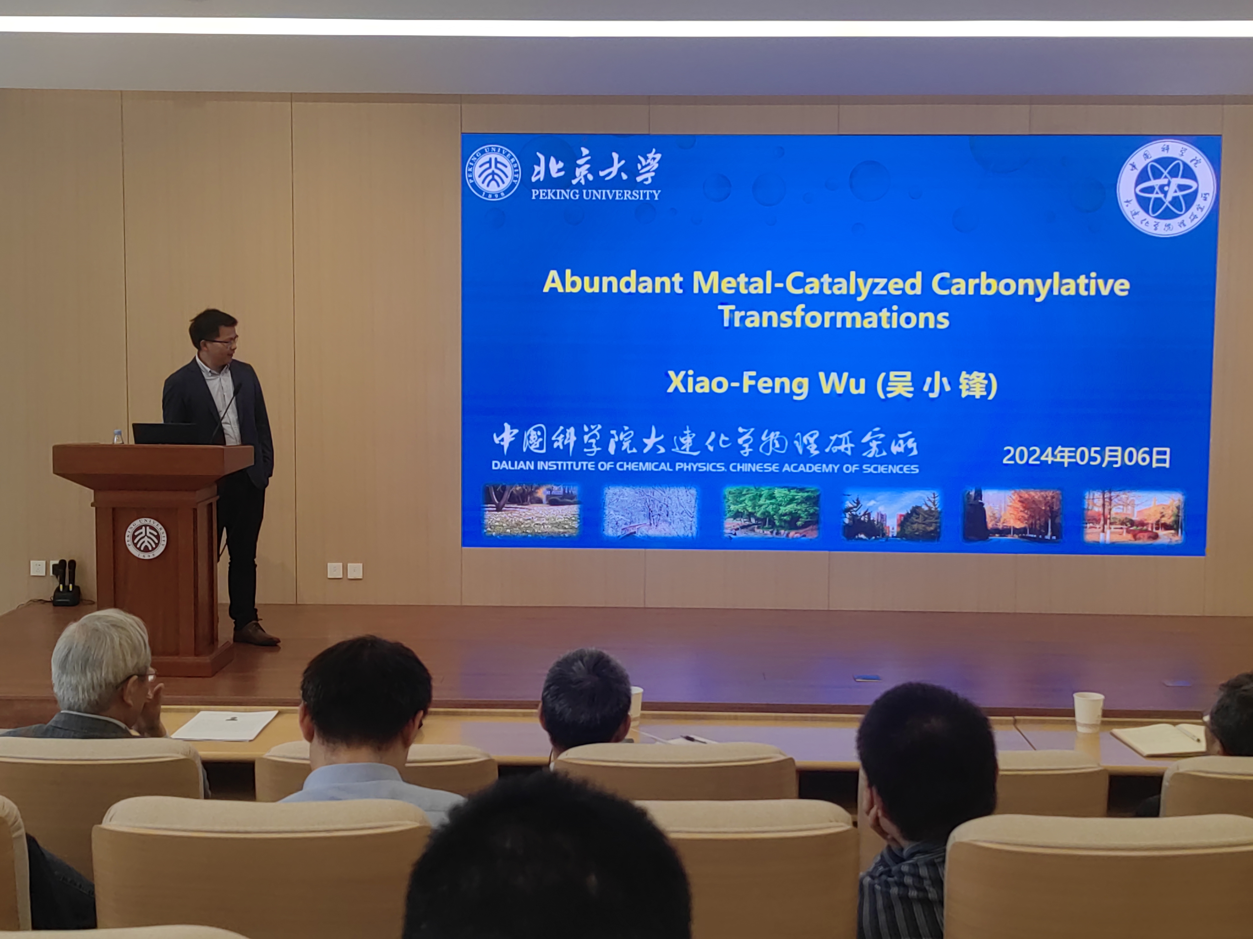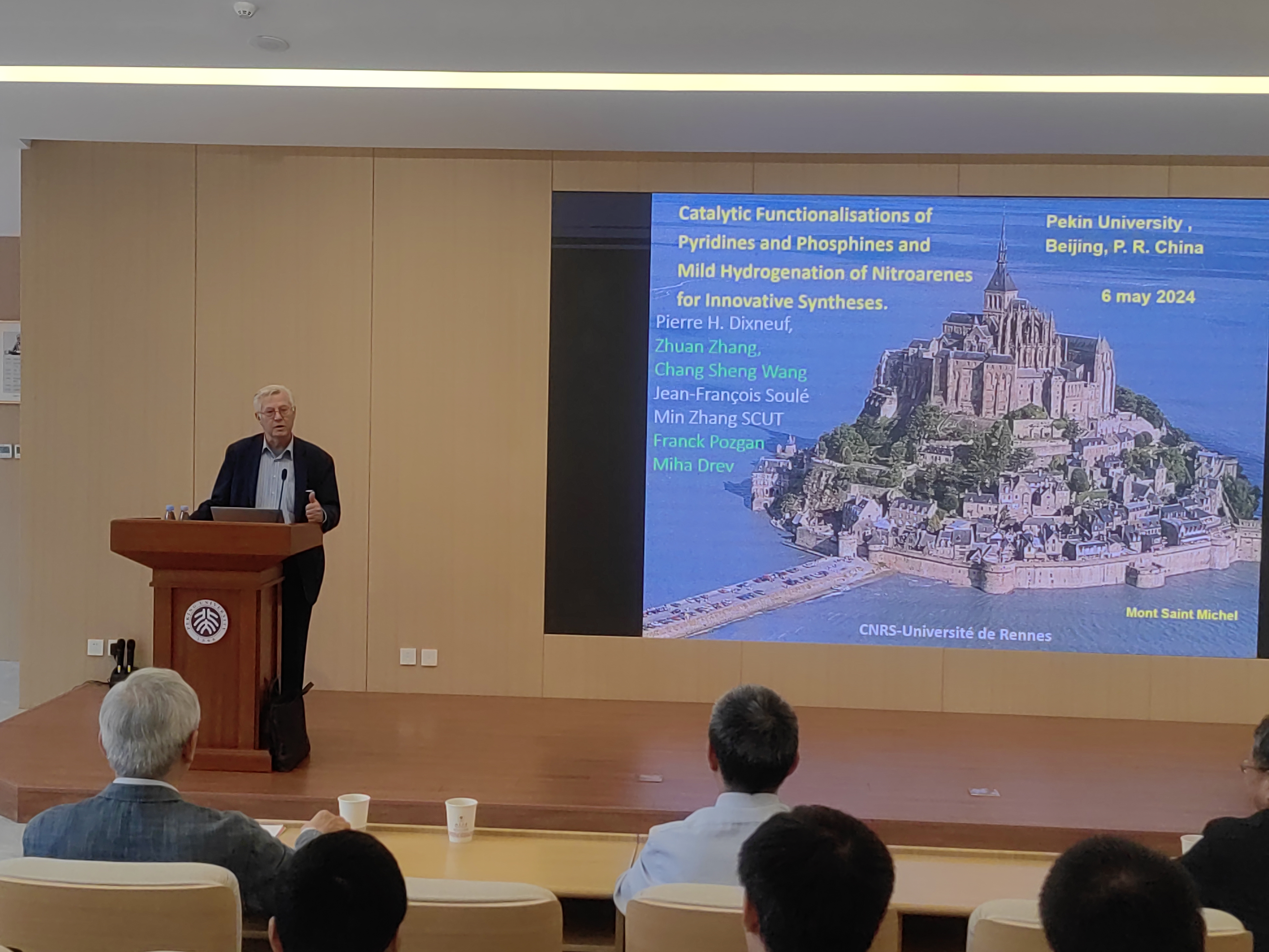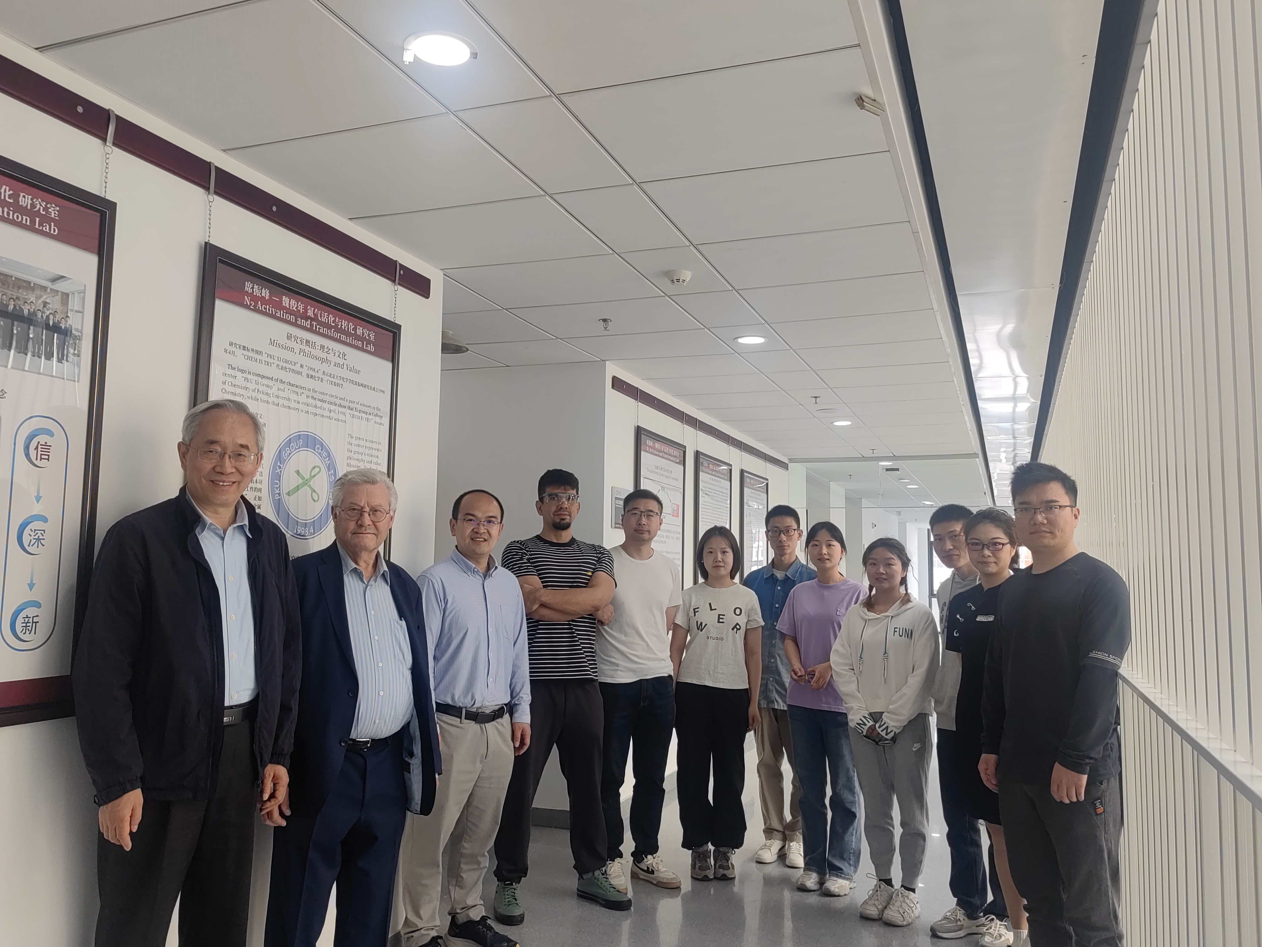 5月6日,应席老师的邀请,法国雷恩第一大学的Dierre H. Dixneuf教授和中国科学院大连化学物理研究所的吴小锋研究员来组访问,在课题组概览展板前与老师、同学们合照。下午,中国化学会秘书长范青华研究员为Dixneuf教授颁发了中国化学会荣誉会士证书,随后Dixneuf教授做了题为《Catalytic Functionalisations of Pyridines and Phosphines and Mild Hydrogenations of Nitroarenes for lnnovative Syntheses》的报告,吴小锋研究员做了题为《Abundant Metal-Catalyzed Carbonylative Transformations》的报告,并与老师、同学们展开了热烈的交流讨论。