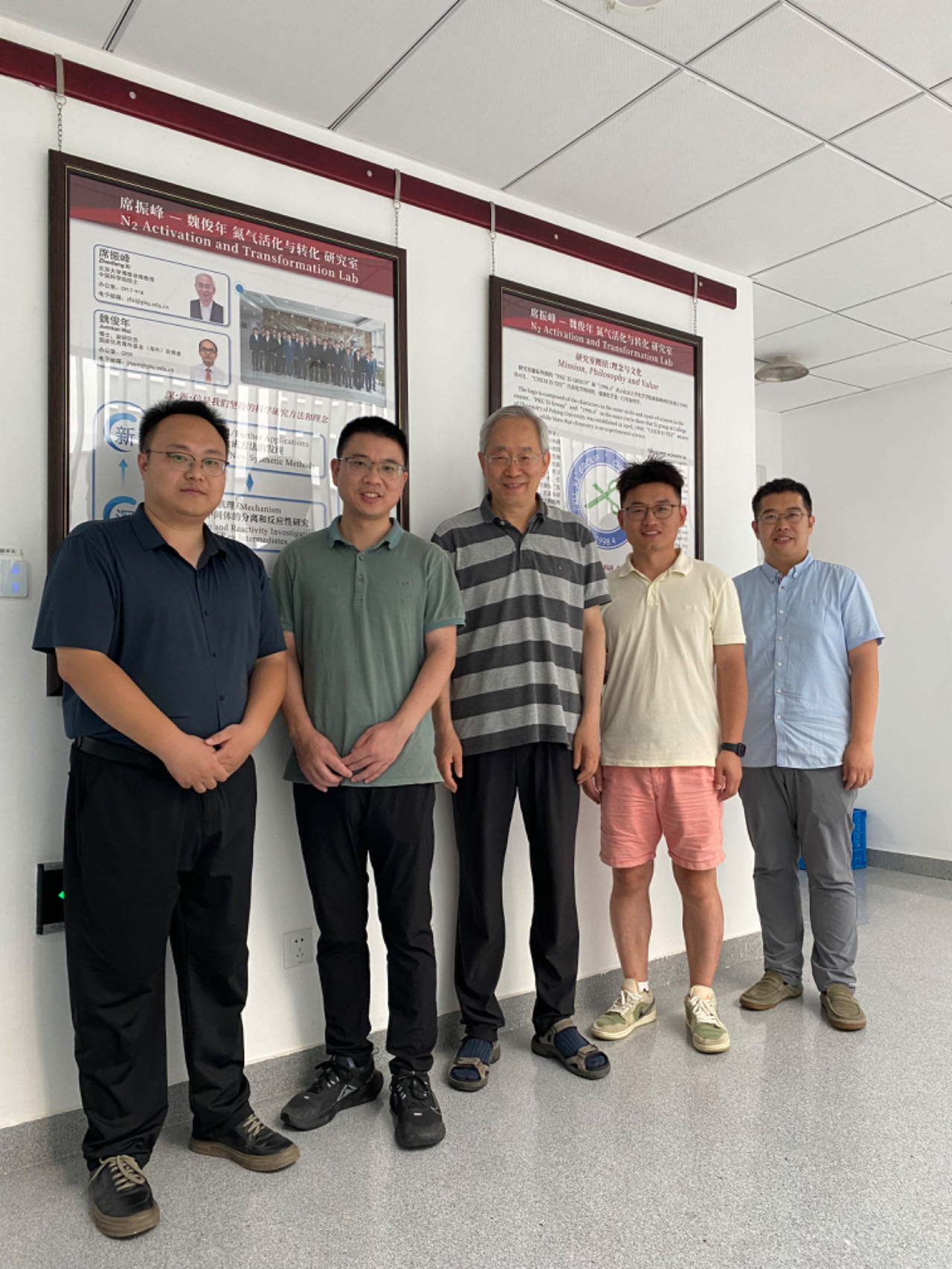热烈欢迎谭庚文、杜景祯和郭帅三位教授来组访问! 时间:2024-07-19 来源:作者: 字体: 【小】 【中】 【大】 7月19日,中山大学谭庚文教授,郑州大学杜景祯教授,首都师范大学郭帅教授来到研究室访问,三位教授参观了实验室各种仪器设备及展板,并和大家一起合影留念。谭庚文教授目前任职于中山大学化学学院,他长期从事新型主族元素化合物的合成、表征与性质研究,近期主要集中研究单配位主族元素化合物。杜景祯教授目前任职于郑州大学化学学院,他长期从事f区金属有机配位化学等相关领域的研究工作。郭帅教授目前任职于首都师范大学化学系,他长期从事氮杂环卡宾的金属有机化学研究。感谢三位教授的来访!