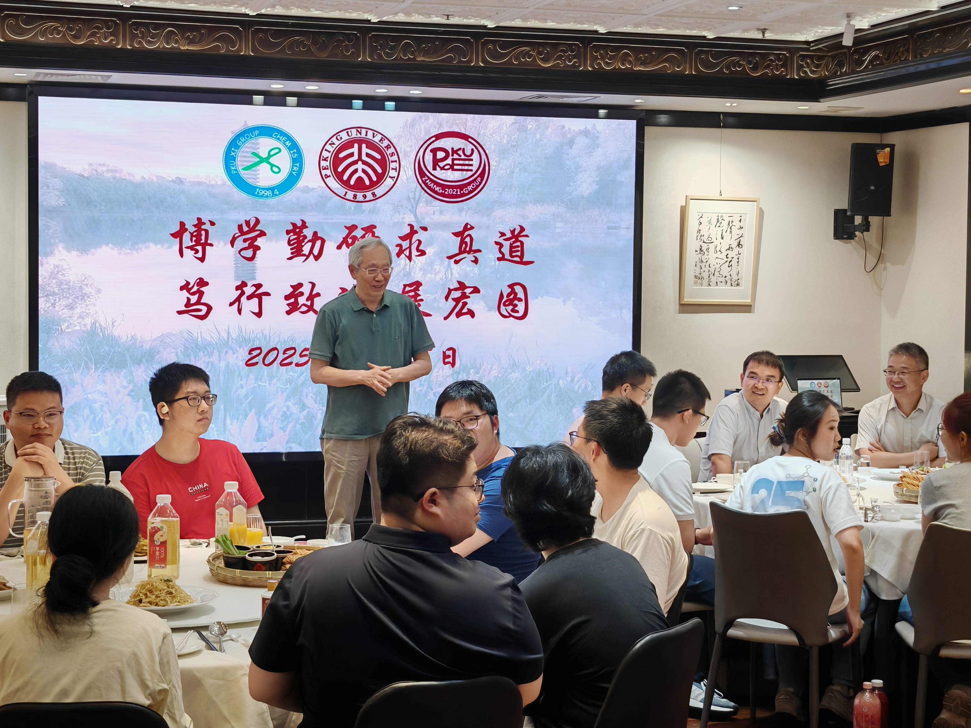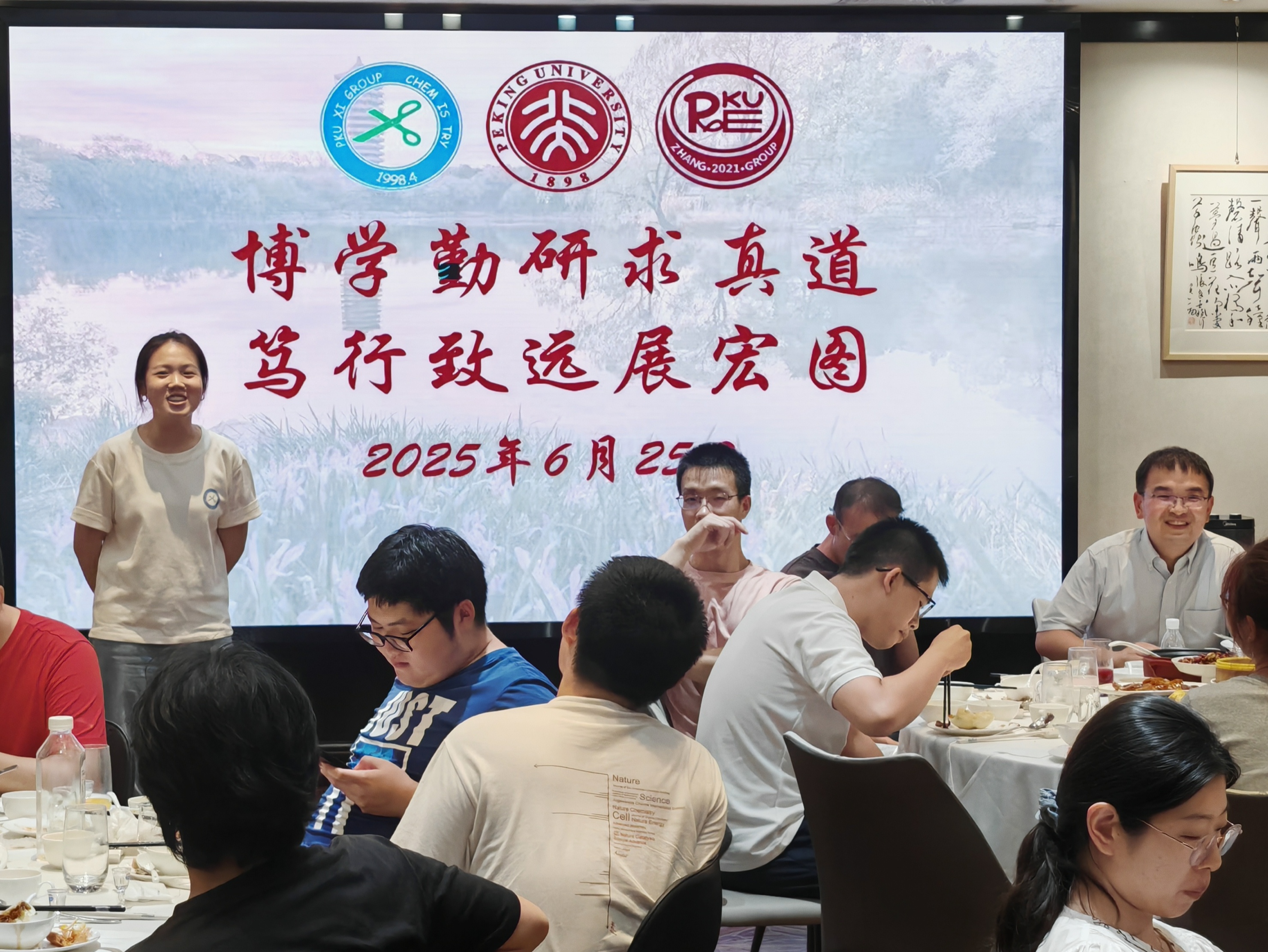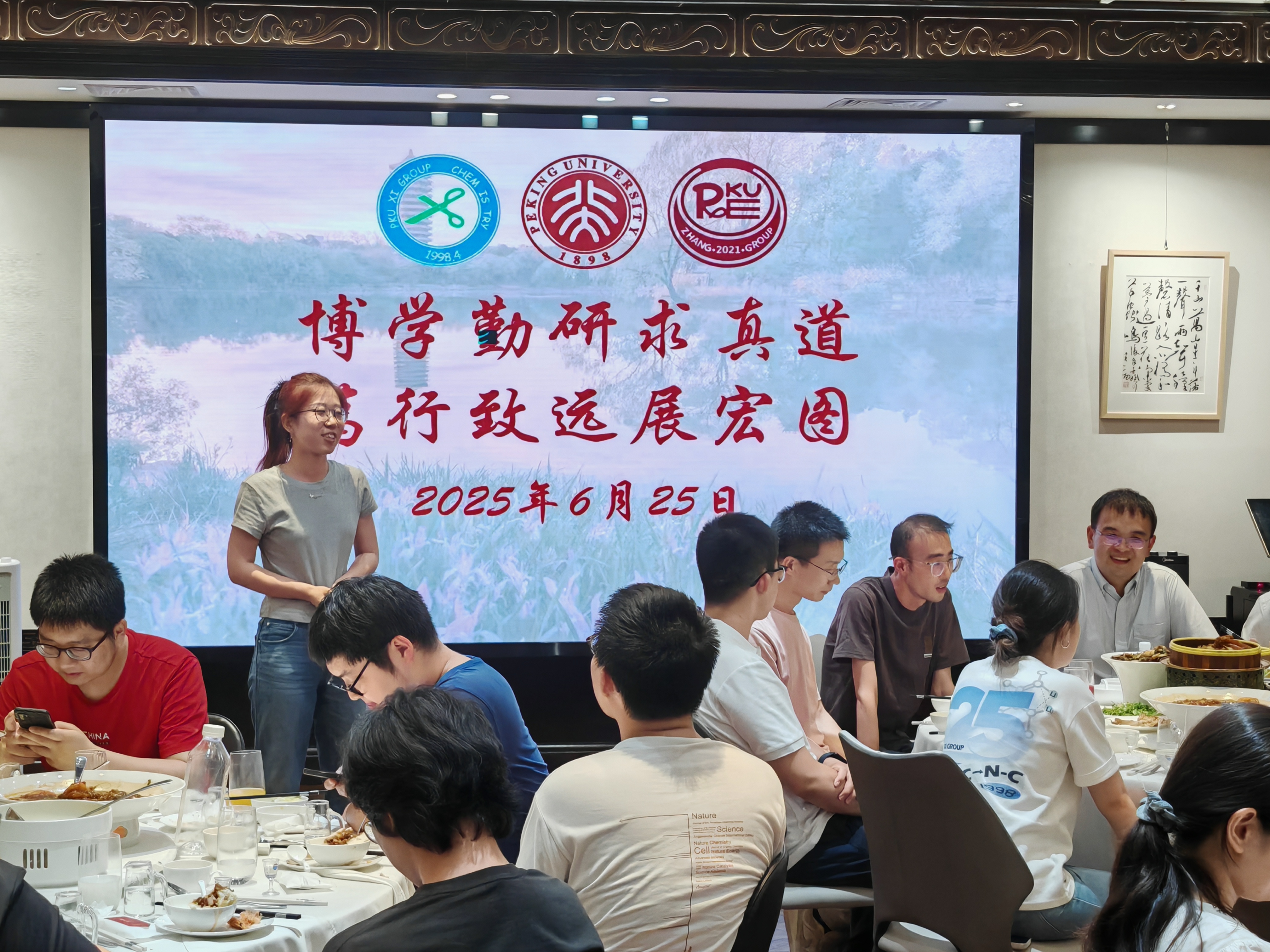 2025年6月26日下午,两个研究室全体成员在A区大楼一起和毕业生拍照留念。当晚大家举行毕业生欢送会,席老师、张老师分别致辞,感谢全体毕业生为两个研究室所做出的贡献,期待他们在未来的研究与工作中取得新的突破!所有毕业生,以及准备离站的博士后师兄们先后回顾了在组期间的科研与生活,感谢三位老师对他们的培养以及实验室所有同学的帮助,祝愿研究室取得更多更出色的研究成果,并祝愿师弟师妹们科研顺利!