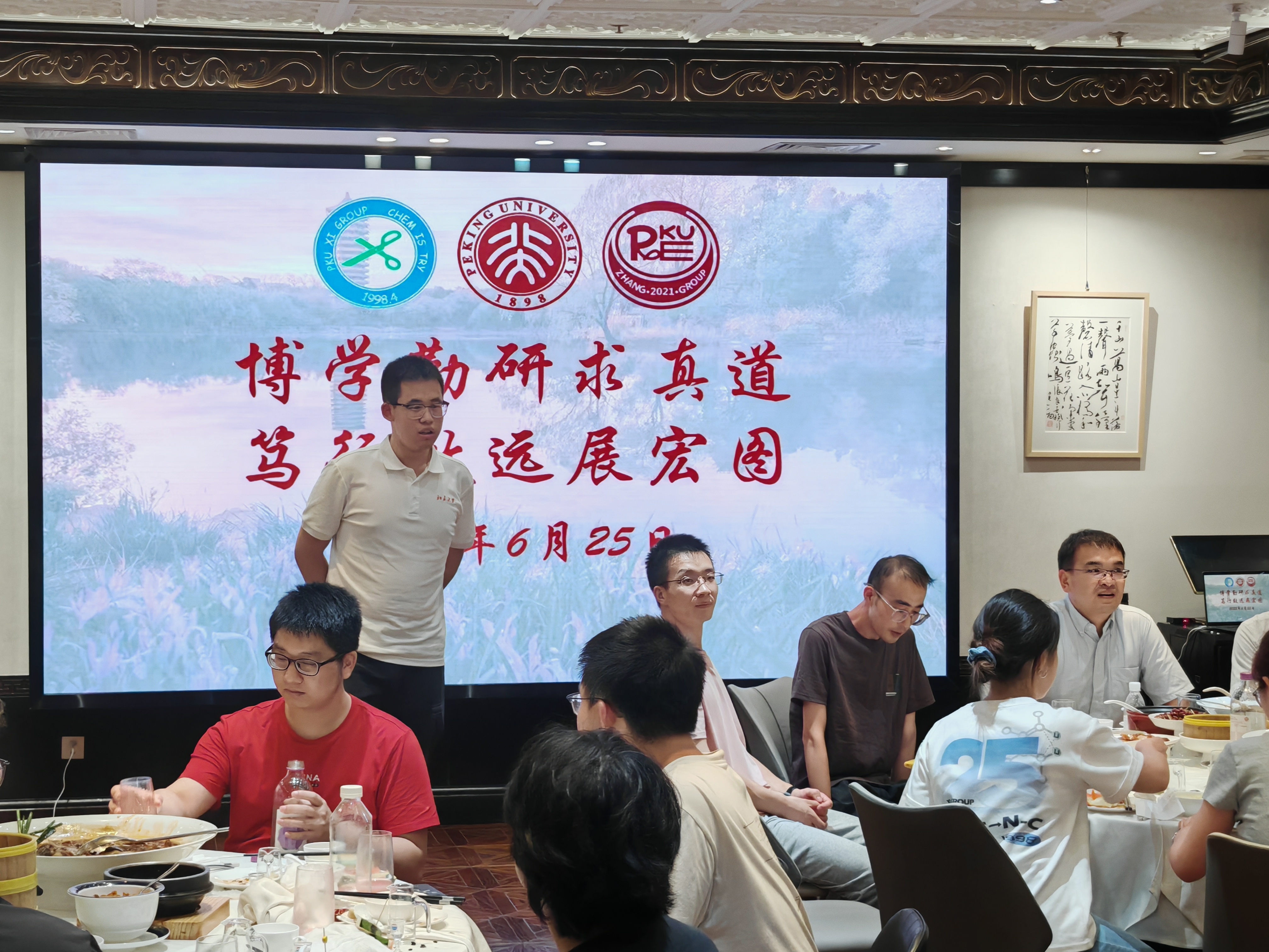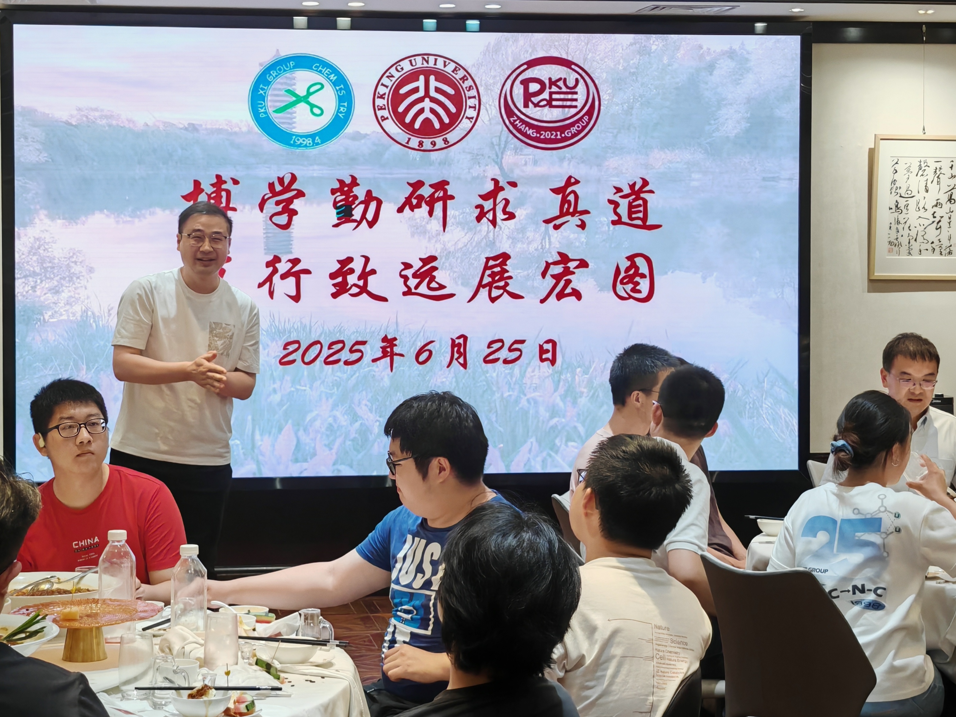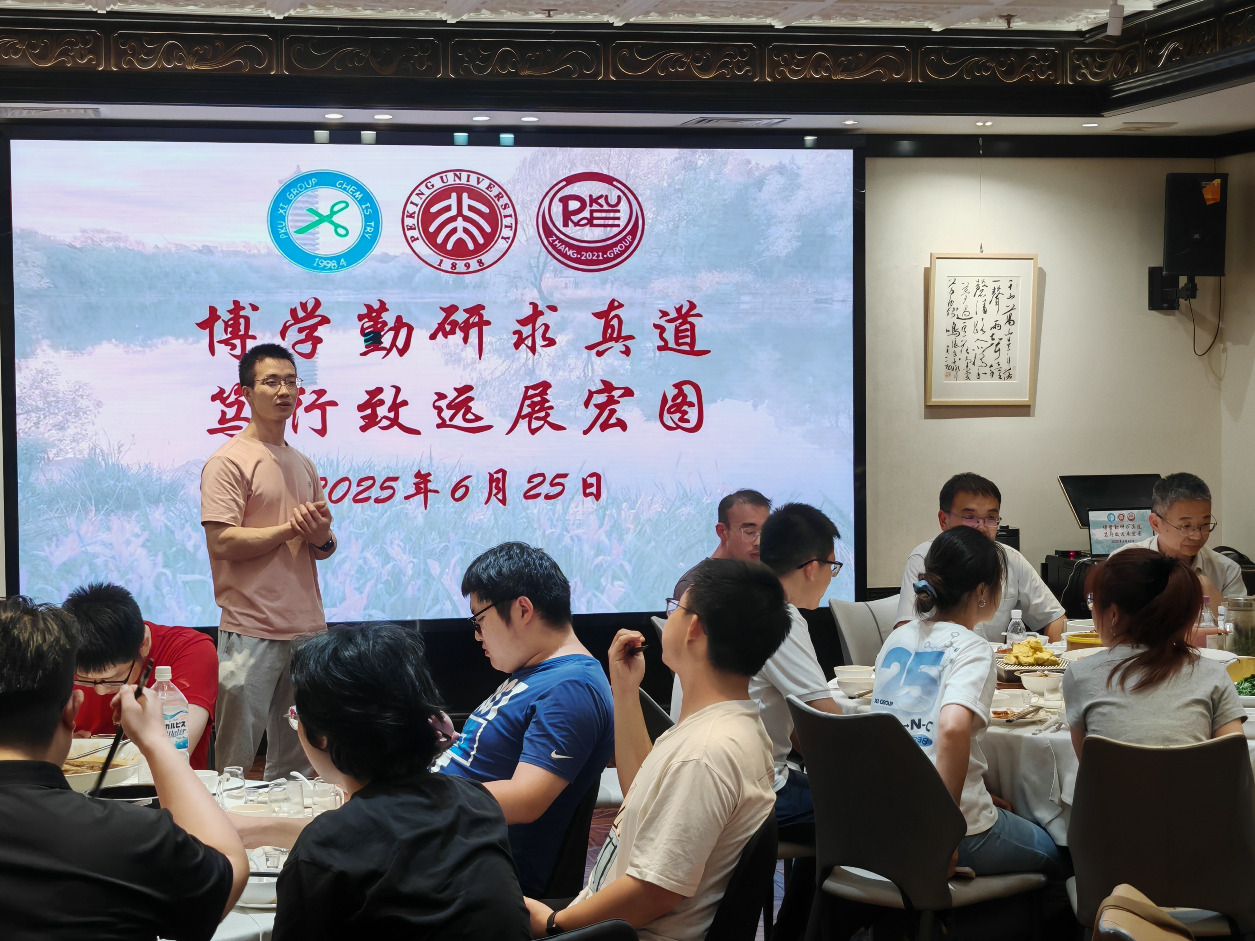 2025年6月26日下午,两个研究室全体成员在A区大楼一起和毕业生拍照留念。当晚大家举行毕业生欢送会,席老师、张老师分别致辞,感谢全体毕业生为两个研究室所做出的贡献,期待他们在未来的研究与工作中取得新的突破!所有毕业生,以及准备离站的博士后师兄们先后回顾了在组期间的科研与生活,感谢三位老师对他们的培养以及实验室所有同学的帮助,祝愿研究室取得更多更出色的研究成果,并祝愿师弟师妹们科研顺利!