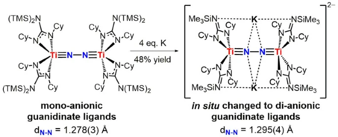 The synthesis, characterization, and theoretical studies of titanium-μ-N2 complexes with di-anionic guanidinate ligands were reported as the first example of its kind. Thus, with (Me3Si)2N-guanidinate ligands, the mono-anionic guanidinate-supported titanium-μ-N2 complex 1 was obtained. Then, reduction of 1 with potassium afforded the di-anionic guanidinate-supported titanium-μ-N2 complex 2 via cleavage of one N—Si bond of the (Me3Si)2N substituents in 1, changing the guanidinate ligands automatically from mono-anionic to di-anionic and remarkably lengthening the bond length of the µ-N2. Characteristic studies and DFT calculations were performed to reveal that the di-anionic guanidinate ligands stabilized the geometry of 2 and increased the charge density on the bridging dinitrogen.