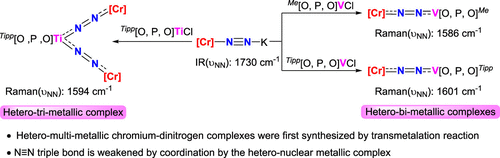 In the domain of N2 activation, hetero-bimetallic dinitrogen complexes are garnering substantial interest due to their potential to induce polarization in nonpolar N2 gas. Herein, we present the syntheses and characterizations of three novel hetero-multimetallic dinitrogen complexes: Cp*Cr(depe)N2V(depe)Me[O,P,O] 5, Cp*Cr(depe)N2V(depe)Tipp[O,P,O] 6, and [Cp*Cr(depe)N2]2TiTipp[O,P,O] 7. These complexes were synthesized via a transmetalation process involving the treatment of [Cr0–N2]− complex 4 with vanadium and titanium chloride complexes bearing alkyl or aryl substituted bis(o-hydroxyphenyl)-phenyl phosphine R[O,P,O] ligand (alkyl = methyl, aryl = 2,4,6-tri-isopropylbenzene). X-ray analysis shows that complexes 5 and 6 exhibit heterodinuclear structures, while complex 7 exhibits a heterotrinuclear core with two N2 ligands concurrently coordinated to two chromium and one titanium atoms. Raman spectroscopic data show that the N–N stretching vibration of the N2 moiety is clearly downshifted relative to free N2 and to mononuclear [Cr0–N2]− complex 4.