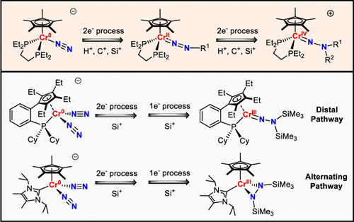 In this Account, we summarize our recent work on the synthesis, spectroscopic features, electronic structures, and reactivities of several Cr–N2 complexes. Initially, a series of dinuclear and trinuclear Cr(I)–N2 complexes bearing cyclopentadienyl-phosphine ligands were accessed. However, they cannot achieve N2 functionalization but undergo oxidative addition reactions with phenylsilane, azobenzene, and other unsaturated organic compounds at the low-valent Cr(I) centers rather than at the N2 unit. Further reduction of these Cr(I) complexes leads to the formation of more activated mononuclear Cr(0) bis-dinitrogen complexes. Remarkably, silylation of the cyclopentadienyl-phosphine Cr(0)–N2 complex with Me3SiCl afforded the first Cr hydrazido complex. This process follows the distal pathway to functionalize the Nβ atom twice, yielding an end-on η1-hydrazido complex, Cr(III)═N–N(SiMe3)2. In contrast, upon substitution of the phosphine ligand in the Cr(0)–N2 complex with a N-heterocyclic carbene (NHC) ligand, the corresponding reaction with Me3SiCl proceeds via the alternating pathway; the silylation occurs at both Nα and Nβ atoms and generates a side-on η2-hydrazido complex, Cr(III)(η2-Me3SiN–NSiMe3). Both silylation reactions are inevitably accompanied by the formation of Cr(III) hydrazido complexes and Cr(II) chlorides with a 2:1 ratio. These processes exhibit a peculiar ′3-4-2-1′ stoichiometry (i.e., treating 3 equiv of Cr(0)–N2 complexes with 4 equiv of Me3SiCl yields 2 equiv of Cr(III) disilyl-hydrazido complexes and 1 equiv of Cr(II) chloride). Upon replacing the monodentate phosphine and/or NHC ligand with a bisphosphine ligand, a monodinitrogen Cr(0) complex, instead of the bis-dinitrogen Cr(0) complexes, is obtained; consequently, the silylation reactions progress via the normal two-electron route, which passes through Cr(II)–N═N–R diazenido species as an intermediate and furnishes [Cr(IV)═N–NR2]+ hydrazido as the final products. More importantly, this type of Cr(0)–N2 complex can be not only silylated but also protonated and alkylated proficiently. All of the second-order reaction rates of the first and second transformations are determined along with the lifetimes of the intervening diazenido species. Based on these findings, we have successfully carried out nearly quantitative preparations of the Cr(IV) hydrazido species with unmixed or hybrid substituents.
