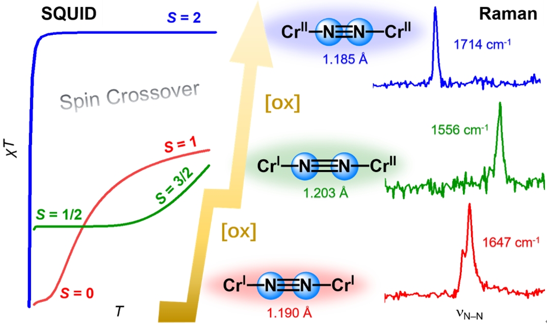 我们利用SQUID,EPR,Evans磁化率,Raman,UV-vis等一系列光谱学表征手段结合高精度的从头算方法,开展了一系列双核铬氮气配合物{[Cp*Cr(dmpe)]2(μ-N2)}0/1+/2+电子结构的系统性研究。实验结果表明双核铬氮气配合物在固态和溶液态下均存在自旋交叉(spin crossover)现象。其中,{[Cp*Cr(dmpe)]2(μ-N2)}0出现S = 0 到S = 1的自旋交叉,{[Cp*Cr(dmpe)]2(μ-N2)}1+出现S = 1/2 到S = 3/2的自旋交叉。这类双核金属配合物的自旋交叉现象极为罕见,自旋态的转变并不是单个过渡金属中心的行为,而是Cr-N2-Cr单元整体自旋态的变化。多光谱学表征结果说明这些铬氮气配合物具有很近的激发态,其电子结构具有多组态性质。CASSCF/NEVPT2的计算结果也进一步证实了双核铬氮气配合物的多组态电子结构特征。
