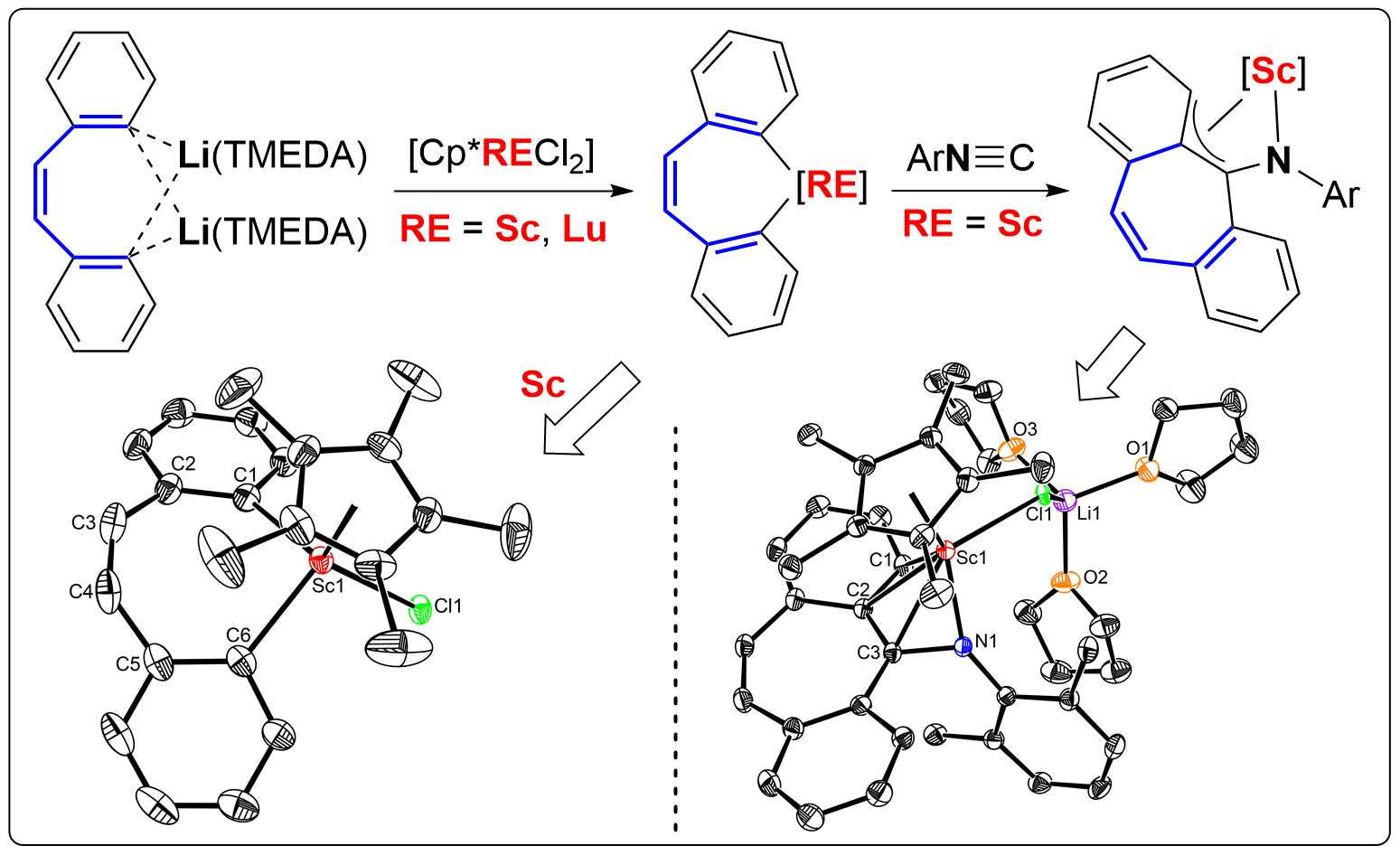 As the key intermediates in metal catalyzed [2 + 2 + 2] cycloaddition reactions of three alkynes, main-group and transition metallacycloheptatrienes have been studied for decades, but rare-earth analogues have remained exclusive. Herein, we report the well-defined rare-earth metallacycloheptatrienes 2-Sc and 2-Lu obtained in high yields via the reaction of Cp*Li (Cp* = pentamethylcyclopentadienyl) and RECl3 (RE = Sc, Lu) with TMEDA coordinated 2,2'-dilithio- Z -stilbene 1. Single crystal structure of 2-Sc (RE = Sc) reveals it to be a separate ion pair, and the scandacycloheptatriene ring adopts a nonplanar boat-like conformation. The reactivity of compounds 2-Sc and 2-Lu has been investigated. When 2-Sc was treated with 2,6-dimethylphenyl isocyanide, compound 3 was obtained via the successive 1,1-insertion and 1,2-insertion of the isocyanide. The structure of 3 has also been fully characterized.
