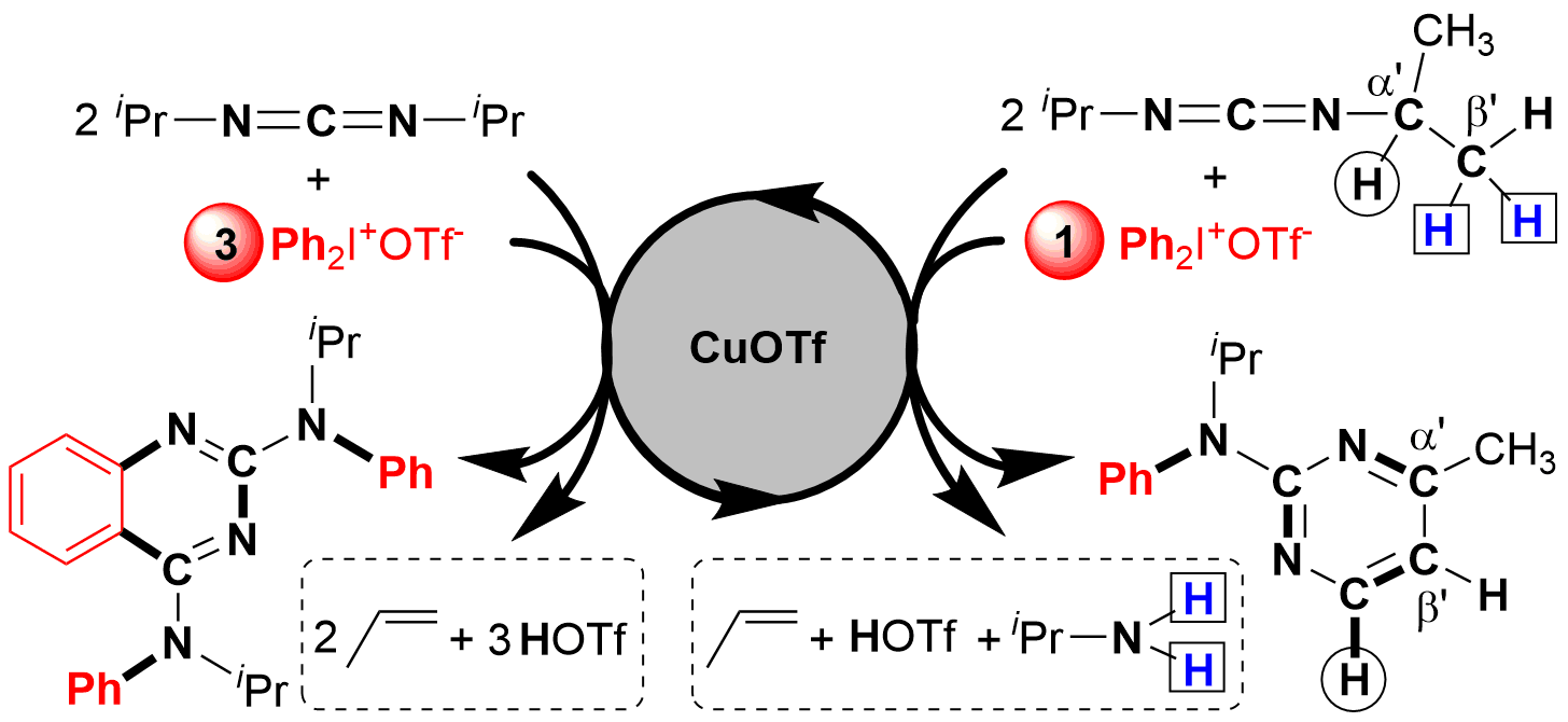 131. Yue Chi, Haihan Yan, Wen-Xiong Zhang*, and Zhenfeng Xi*, CuOTf-Catalyzed Selective Generation of 2-Aminopyrimidines from Carbodiimides and Diaryliodonium Salts by a Triple C(sp3)‒H Functionalization,