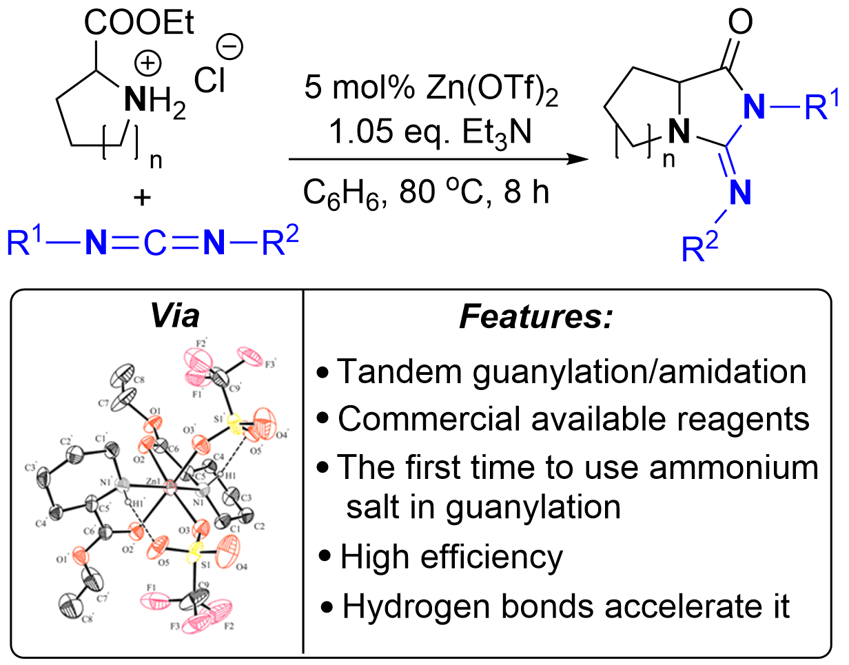 119. Yue Chi, Ling Xu, Shanshan Du, Haihan Yan, Wen-Xiong Zhang*, and Zhenfeng Xi, Synthesis and Mechanistic Study of Cyclic Oxoguanidines via Zn(OTf)2-Catalyzed Guanylation/Amidation from Readily Available Amino Acid Esters and Carbodiimides,