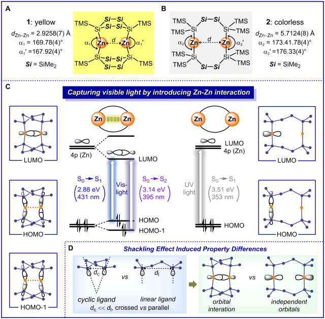 The Zn(II) complex is colorless, which is a common feature unless accompanied by chromophoric moieties. In this issue of Angew. Chem., Wada et al. report a dinuclear Zn(II) complex bearing two non-chromophoric oligosilyl ligands that exhibits visible light absorption. Their work introduces a strategy for constructing Zn-based complexes capable of responding to visible light and extends the photophysical field of zinc chemistry. We are delighted to be invited to highlight this chemistry.