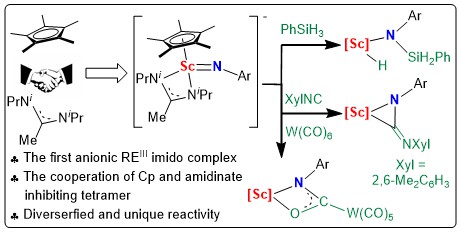 Terminal rare-earth imido complexes containing metal nitrogen double bonds have received more attention in recent years due to their importance in group transformation and catalytic reactions. However, due to the large difference in orbital energy between rare-earth metals and nitrogen, their synthesis is difficult and the product is easy to polymerize. Here we use the combination of Cp* and amidinate ligands to inhibit the tetramerization and provide exclusively the first anionic rare-earth(III) terminal imido complexes with both electron-donating and electron-withdrawing groups. The chemical bond analysis further confirms the double bond character and the strong polarity of the RE=N bond, which could be described as three orbital interactions, is primarily contributed from the imido nitrogen, while the contribution from rare-earth metal is limited. The mechanistic study by DFT calculations shows the formation of the RE=N bond undergo the activation of two N–H bonds. Furthermore, the anionic rare-earth(III) terminal imido complex shows some interesting and unique reactivity towards isocyanate, isonitrile, phenylsilane, and W(CO)6. The work extends the multiple bond chemistry between rare-earth metals and main group elements, and is expected to inspire the development of rare-earth organometallic chemistry and related fields.