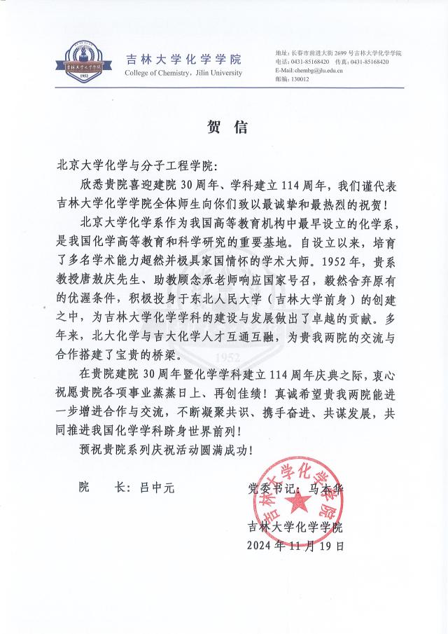 【贺信】吉林大学化学学院