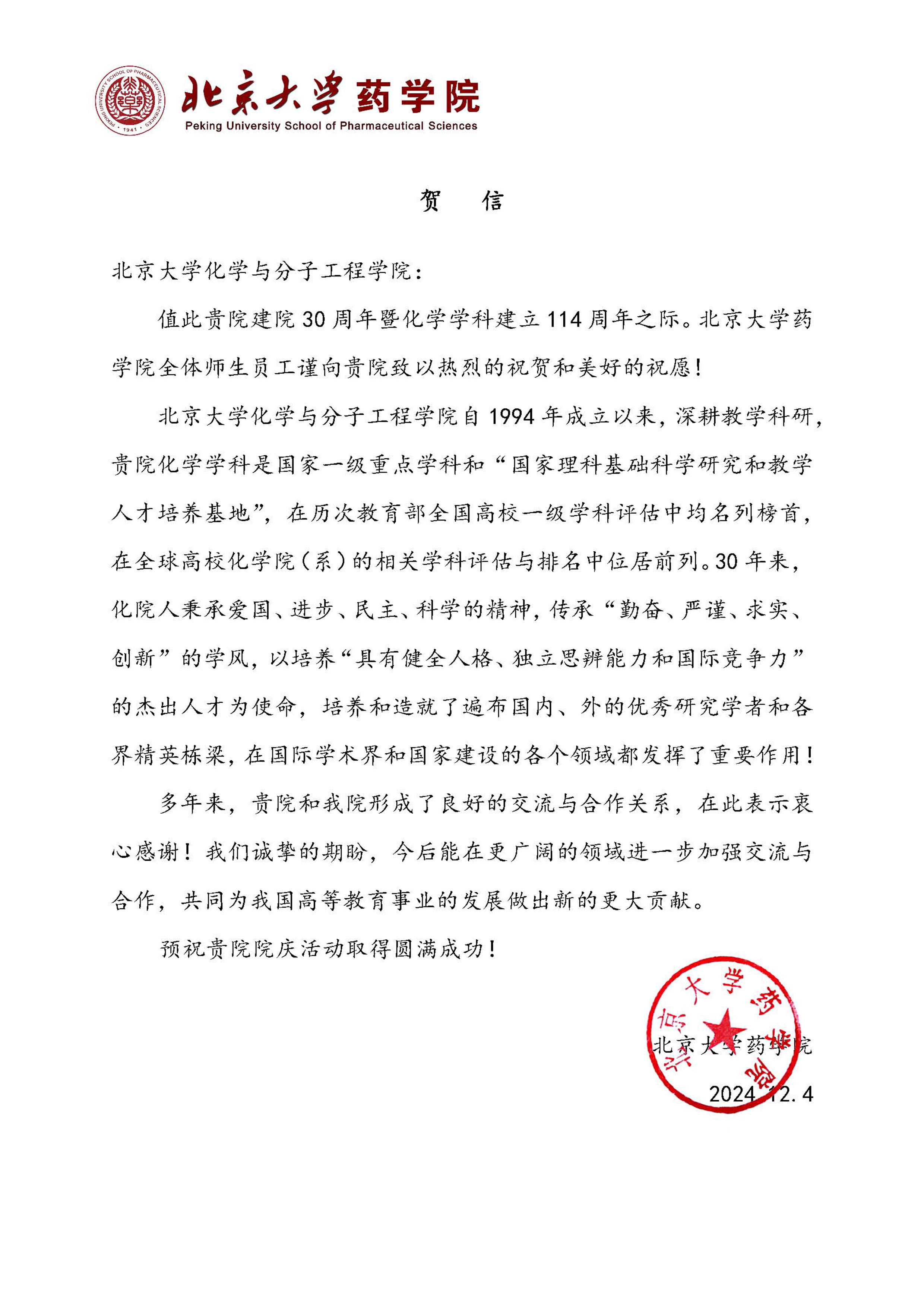 【贺信】-北京大学药学院