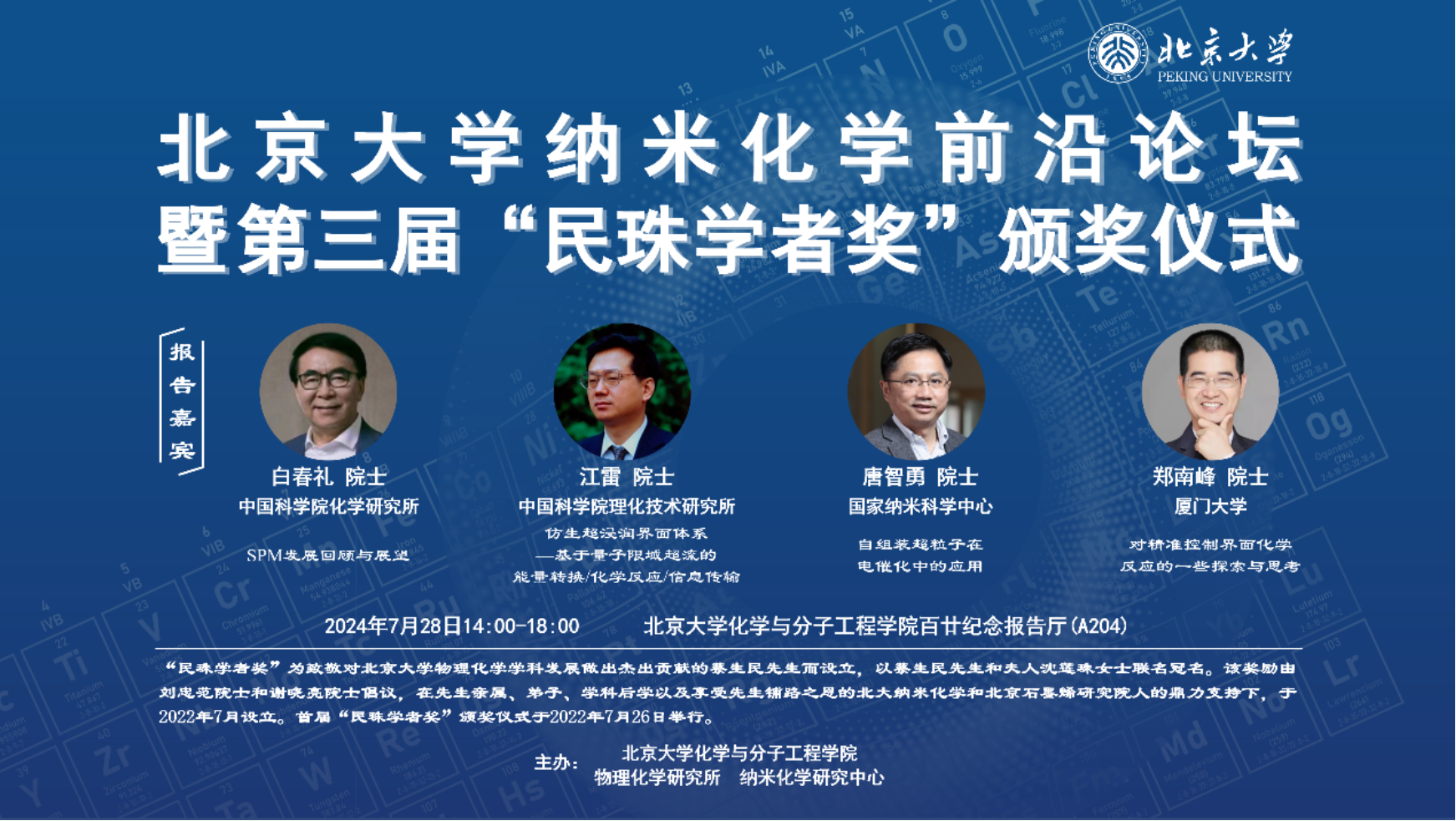 2024年7月28日,由北京大学化学与分子工程学院主办的北京大学纳米化学前沿论坛暨第三届“民珠学者奖”颁奖仪式在北京大学化学与分子工程学院百廿纪念报告厅(A204)成功举行。本次活动汇聚了我国表界面物理化学与纳米科技领域的杰出专家、学者及雄安新区的相关领导,他们共同见证了这一学术盛会。
