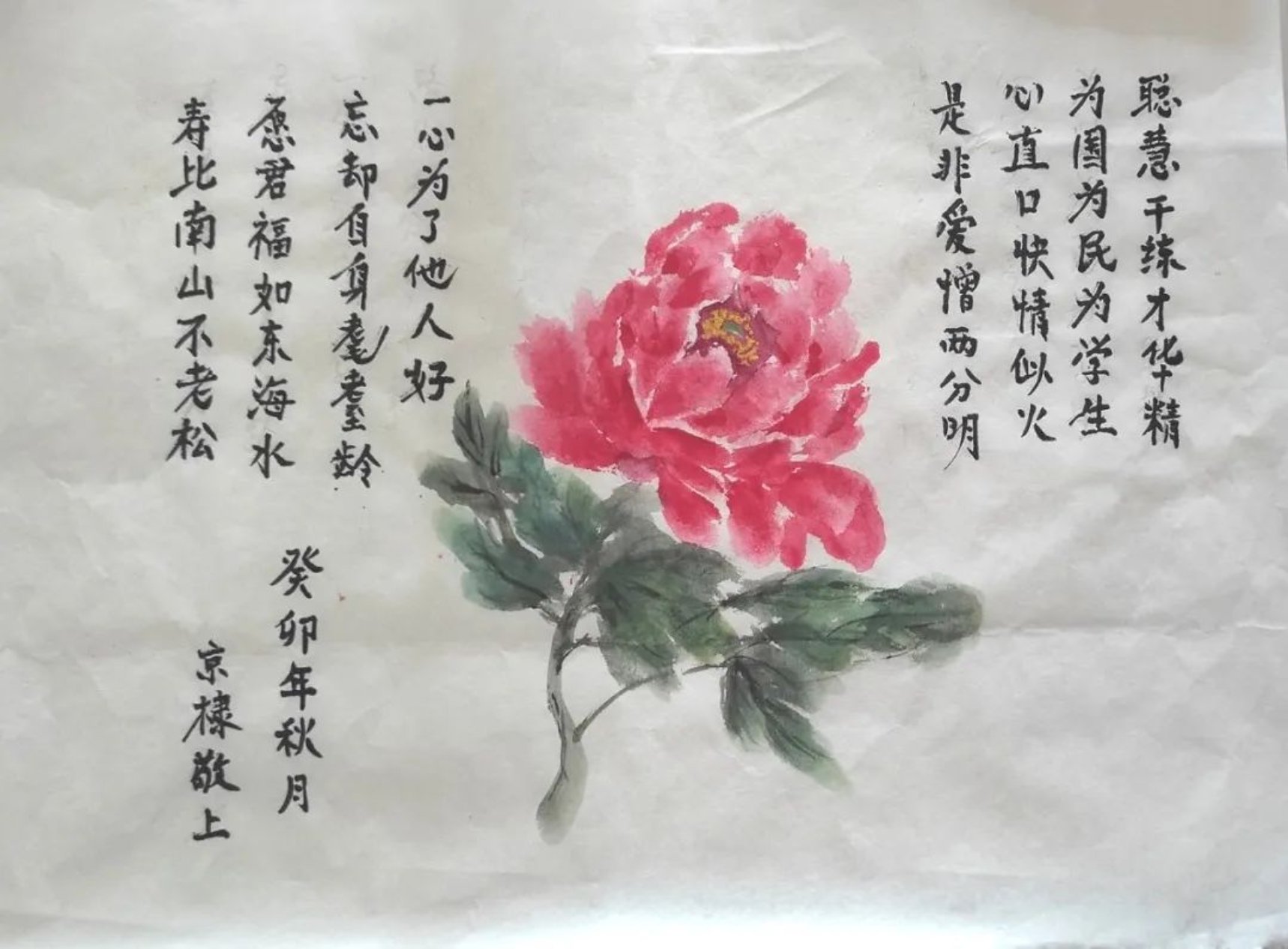 非常凑巧的是,我们在访问彭老师时,正好一位颇有雅趣的邻居来给彭老师送了一幅诗配画作为生日礼物,我们以此作为本文的结尾。
