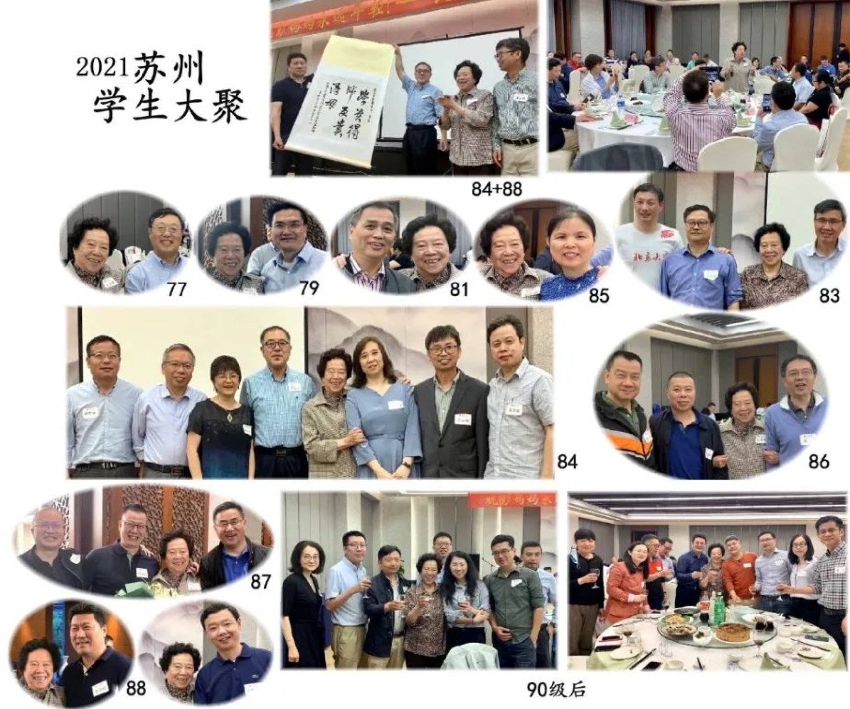 “退休了,特别是我爱人去世后,我有充分的时间接触学生。我去过国内好多地方,每到一处,学生们都要开欢迎会迎接我,这同时也是大家聚会的机会。举2021年在苏州的大聚会为例,当时我在上海,开始是苏州的江必旺(84级)和袁建栋(88级)邀我去苏州。邵宏伟(84级,北京大学苏州校友会秘书长)知道后发布通知,称彭老师将来苏州,要开欢迎会,谁要参加请报名。结果有近百名学生报名!当时正是新冠疫情期间,若发生事故怎么办?我好担心!最后还是举行了,我真感动不已!学生送给我的书法作品上写:学贵得师,更贵得母。这真是给予我作为老师的最高荣誉!”