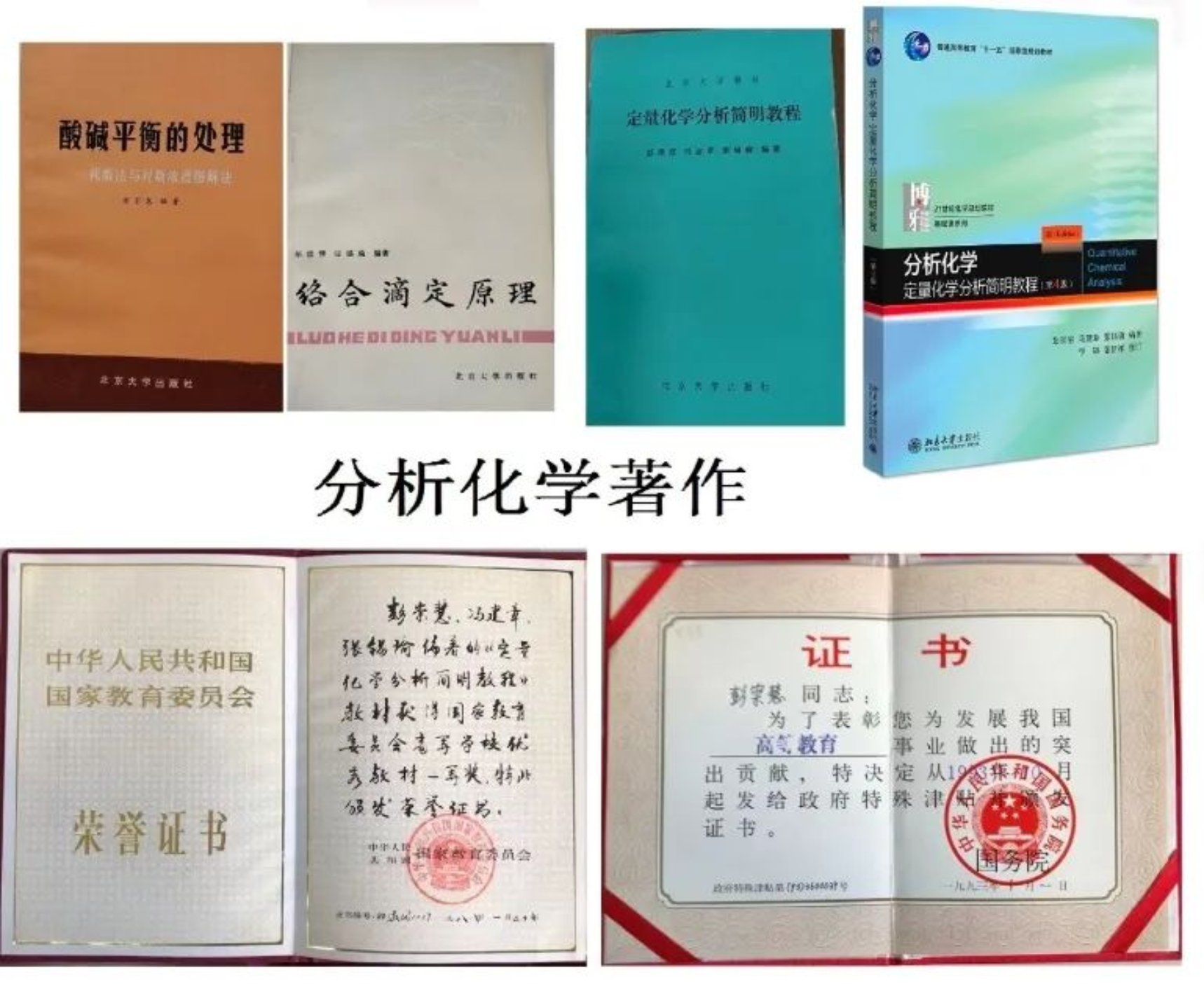 “而后在张先生指导下,仍以我为主将旧讲义修改并加入新的内容,编成了《定量化学分析简明教程》,于84年由北京大学出版社出版。此书于88年被国家教委评为优秀教材一等奖。作为第一作者,我获得政府特殊津贴。实际此书是在张先生亲自指导下完成的,也是他多年教学经验总结,理应由他作为第一作者,但张先生一再推辞,无奈我成了第一作者。”