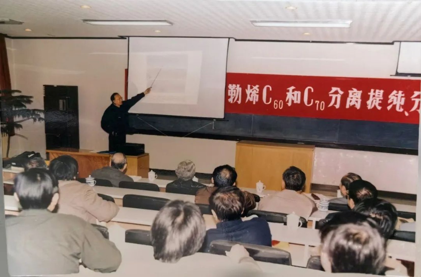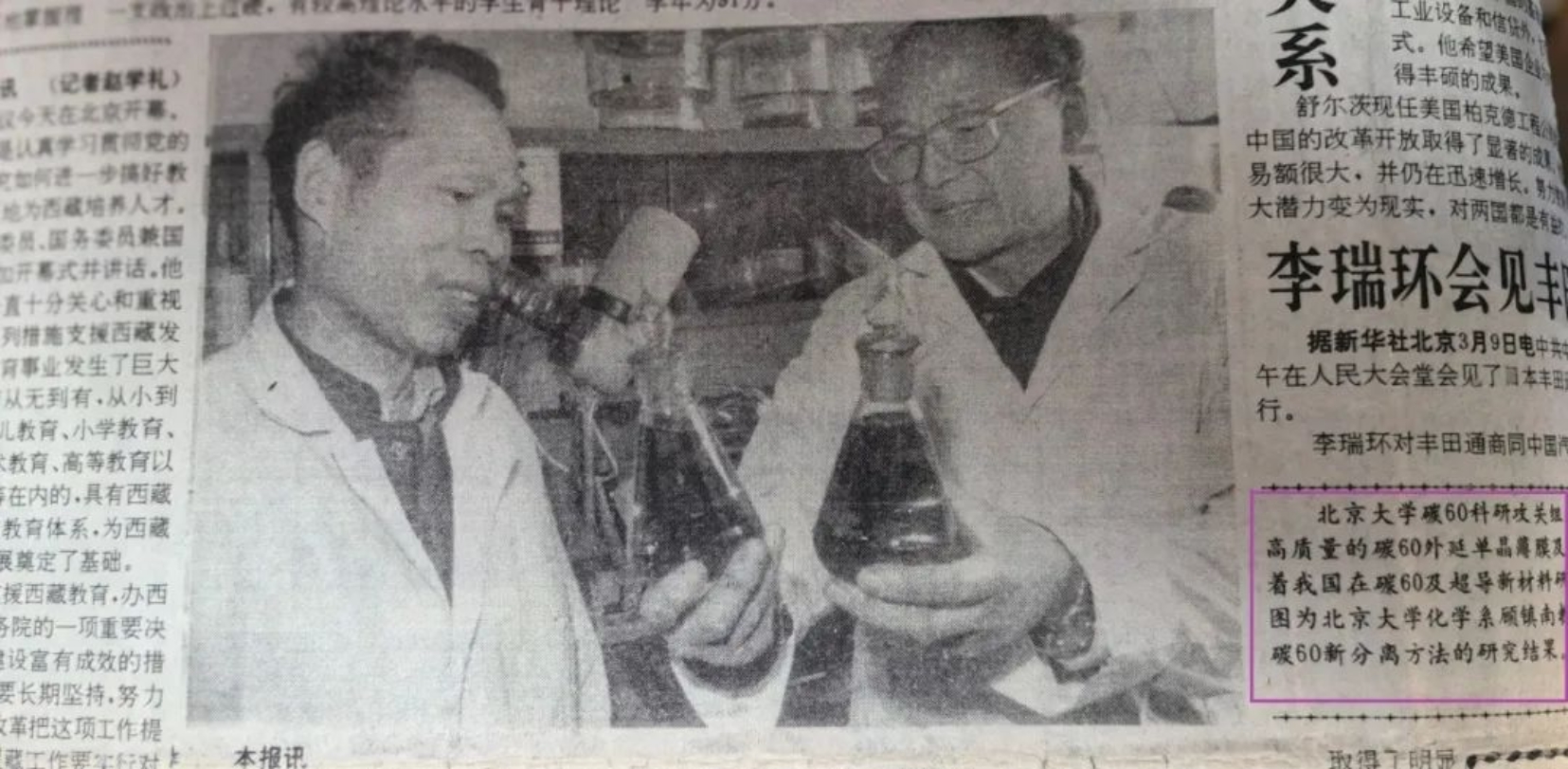 “1990年我花了很多时间在图书馆查文献,了解化学的最新进展。我注意到1985年发现C60的报导,这是一个由60个碳原子组成的笼状分子,结构新奇。C60及类似结构分子被命名为富勒烯,但大量合成一直没有成功。到1990年底,我申请了有关C60的自然科学基金,准备研究C60。正好在我递交申请后,美国科学家用电炉法合成C60成功,C60立即成为科研的热门课题。1991年5月我在大连开会时,被通知立刻回校组织C60研究。我们实验室有一瓶放电所需要的氦气,钱久信老师则慷慨贡献出炼合金用的电弧炉。经过电极改装,很快合成出烟炲,得到紫色的提取液,C60合成成功。后续的质谱分析和核磁分析结果,都是由北京微量化学测试所完成的。学校为此还召开了新闻发布会,宣布北大在国内率先完成C60的合成。”