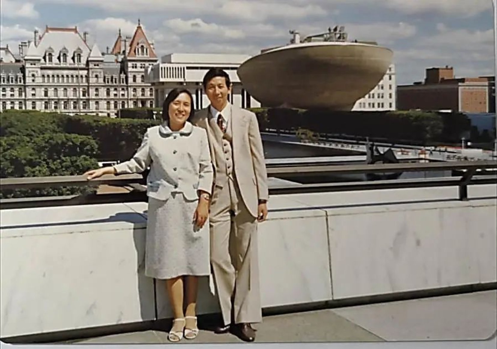 1986年5月在美国纽约州政府大楼前(蛋形建筑是剧场)