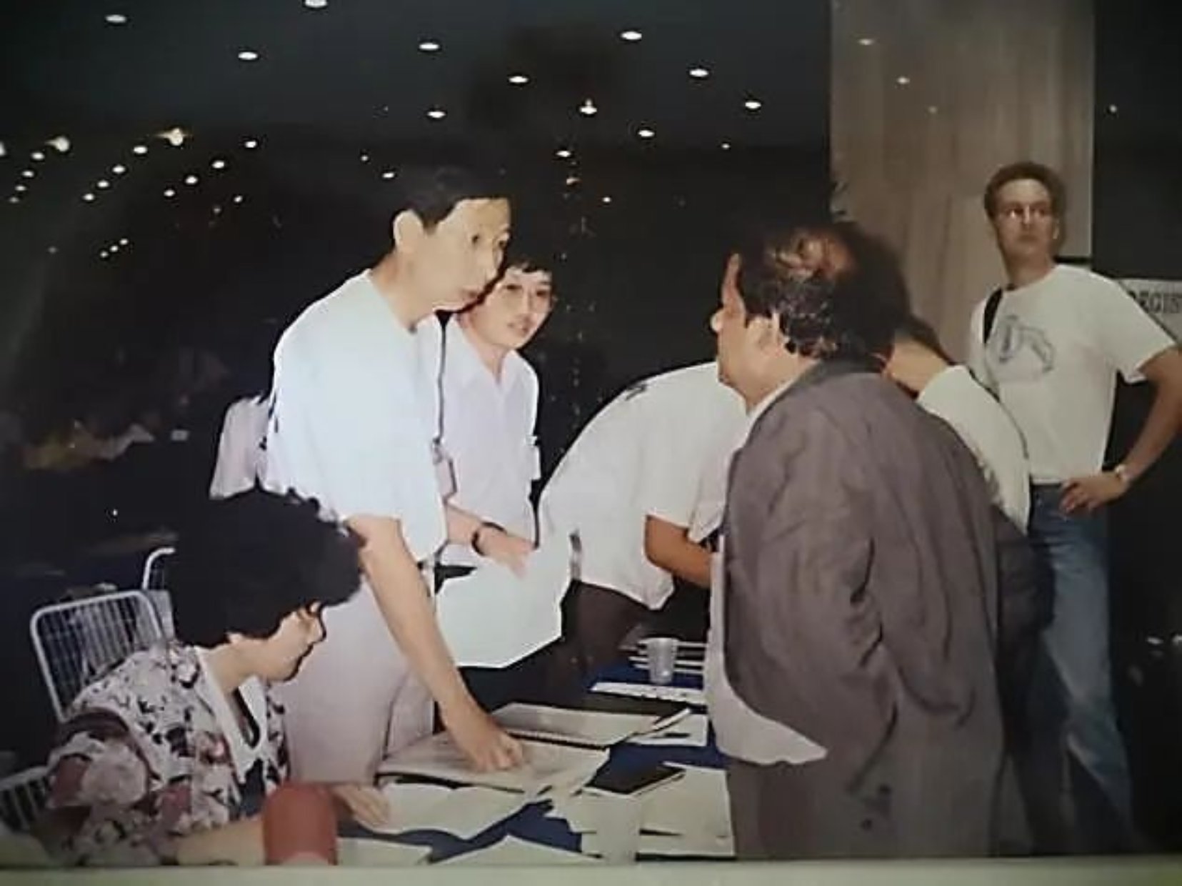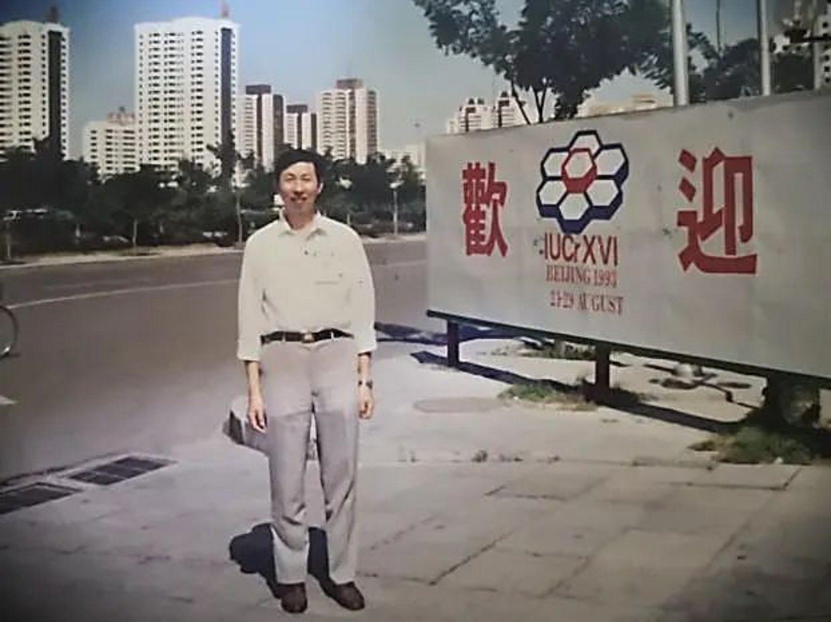 1993年8月金祥林在自己设计的第26届国际晶体学大会会标前留影