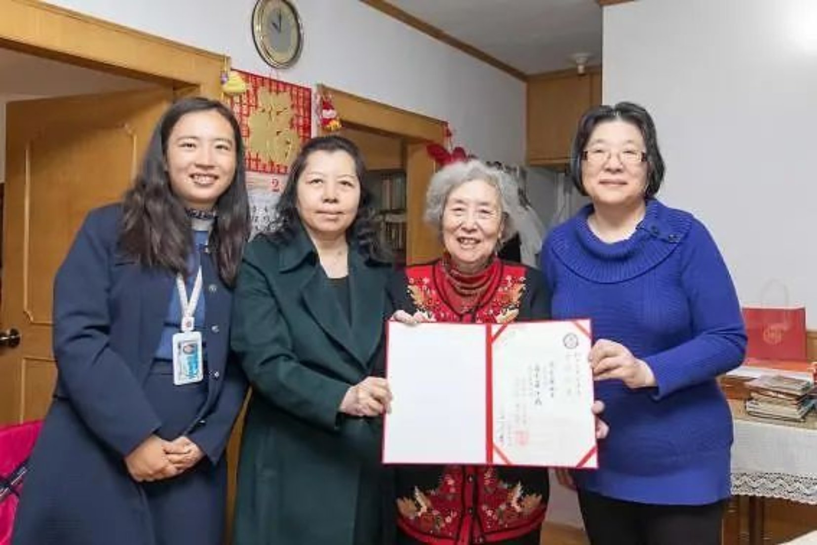 2004年2月刘素清馆长发给受赠证书,左起:季樊、刘素清、汤卡罗、金晶