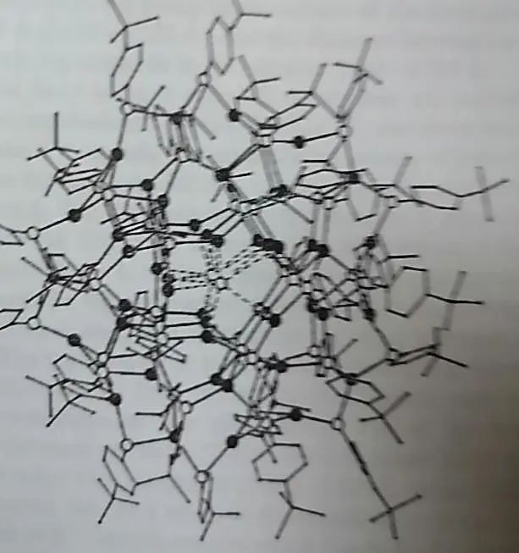 “唐先生的意见给了我很大启发,但我并没有马上着手去做,因为说起来容易做起来难。然后是一个研究生,杨建平,他用异丙基硫酚为配体,做出了一个8核铜的结构,结果发现其中也有二硫化碳插入。我刚看到很惊讶,因为他合成时根本没有用二硫化碳做溶剂。我说你是在开玩笑吧,二硫化碳哪来的?他说是柜子里的,大家都在同一个柜子里培养晶体,有二硫化碳气体渗入进来了。我对他讲,这件事可能成为科研工作的美谈,但论文上是绝对不可以这样写的,你必须用正规的实验重复出来。这个学生很不错,用心实验,真把结果重复出来了。后来我们利用这个新反应合成了一系列大核Ag和Cu的簇合物,其中最引人瞩目的是14核银和14核铜簇合物的合成,同样引起了国际同行的关注。之后我们实验室又合成了大核镉的簇合物,两个8核镉硫簇合物和17核镉簇合物,并研究了它们的性质和结构。终于在2002年我们得到了50核银簇合物和60核银簇合物,这两个簇合物的结构类似,它们的分子直径都已达到了纳米等级,为纳米材料的制备开创了一个新的途径。”