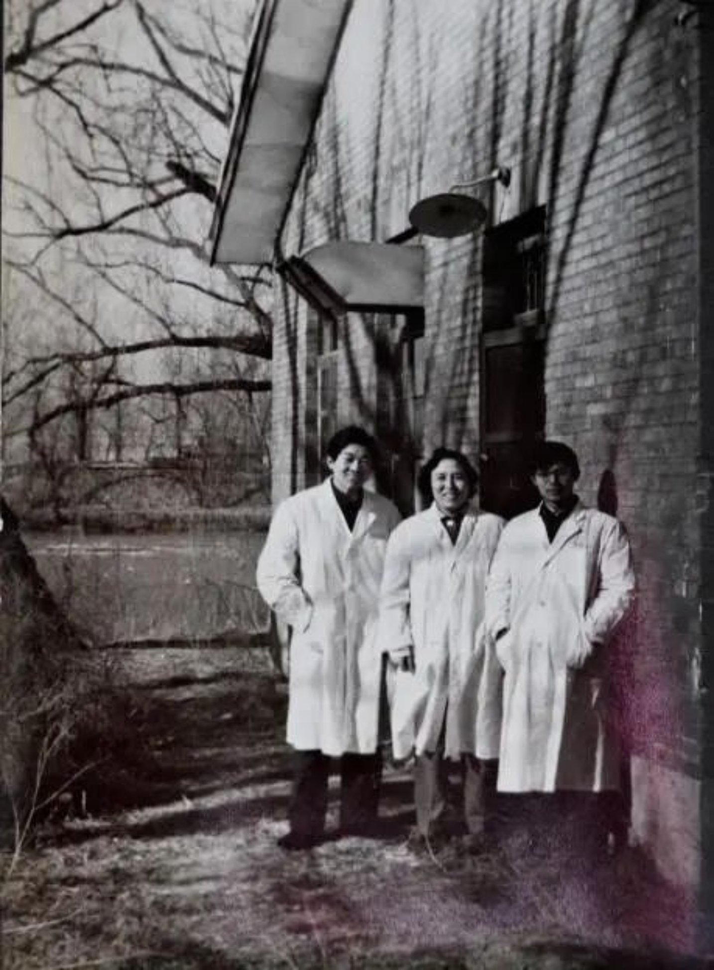 汤老师(中)和77级学生甘宏、利群摄于平房实验室外(1981年冬)