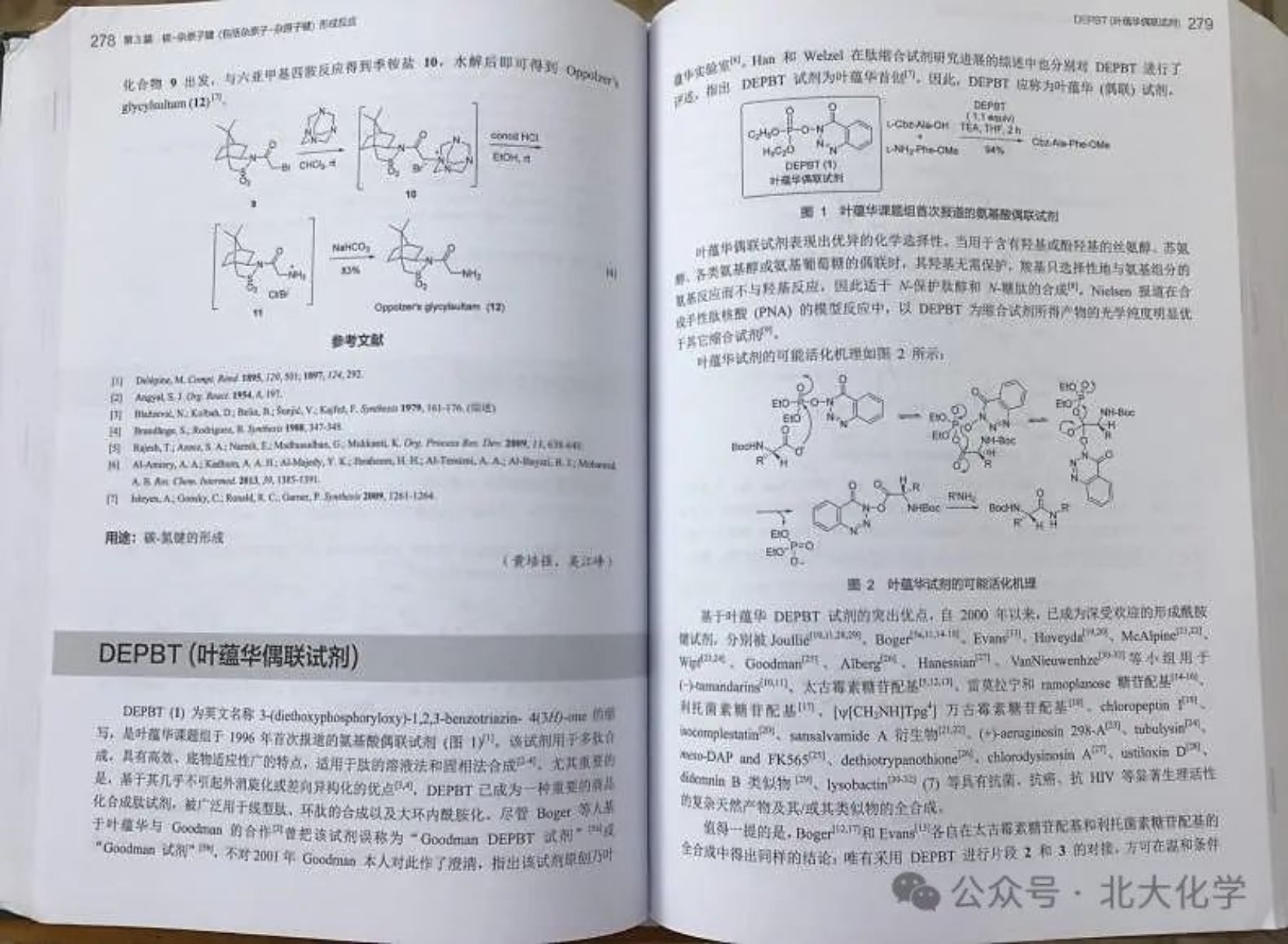 “后来我的几位博士生与硕士生对DEPBT进行了深入研究。博士生高兴明、唐艳春与几位硕士生用该试剂成功的用于环肽的合成,并对影响环化反应的因素及环化规律进行了系统的研究。博士生刘平发现DEPBT不仅表现出优异的立体化学选择性,而且在用于含有羟基或酚羟基的丝氨酸、酪氨酸等与各类氨基醇或氨基葡萄糖作为氨基组分时,用DEPBT偶联剂,其羟基无需保护,羧基只选择性地与氨基组分的氨基反应而不与羟基反应,因此适于N-保护肽醇和糖肽的合成。DEPBT已成为一种重要的合成肽试剂,被广泛用于线性肽、环肽的合成以及大环内酰胺化。现在苏州昊帆生物股份有限公司已进行工业化规模生产,产品出口到欧美各国。过去我们对知识产权缺乏认识,加上新化合物DEPBT的突出优点是在后来的研究中才发现的,所以没有申请专利,对此感到有些遗憾,但是令人高兴的是DEPBT工业化规模的生产是由中国公司成功进行并出口的。”