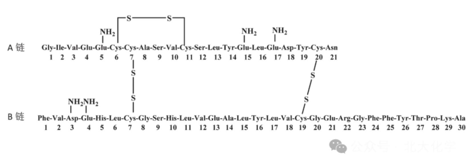 “胰岛素(insulin)是一个蛋白质。它是第一个被发现能够降低血糖,也同时能够促进糖原、脂肪、蛋白质合成的激素。胰岛素分子量比较小,但它的分子结构复杂,所以在蛋白质的结构与功能研究中占有特殊地位。从胰腺中提取的胰岛素经纯化得到结晶后,英国科学家Sanger从1945年起,经过十年的研究,于1955年报道了牛胰岛素的一级结构。他的这项研究成果获得1958年诺贝尔化学奖。胰岛素是由A链和B链两条肽链共51个氨基酸残基组成的生物大分子。下图可见,A链含有11种21个氨基酸残基,A链的6位和11位上的两个Cys(半胱氨酸)通过二硫键相连成环;B链含有16种30个氨基酸残基,A链和B链又通过两对二硫键互相连接成胰岛素分子。”